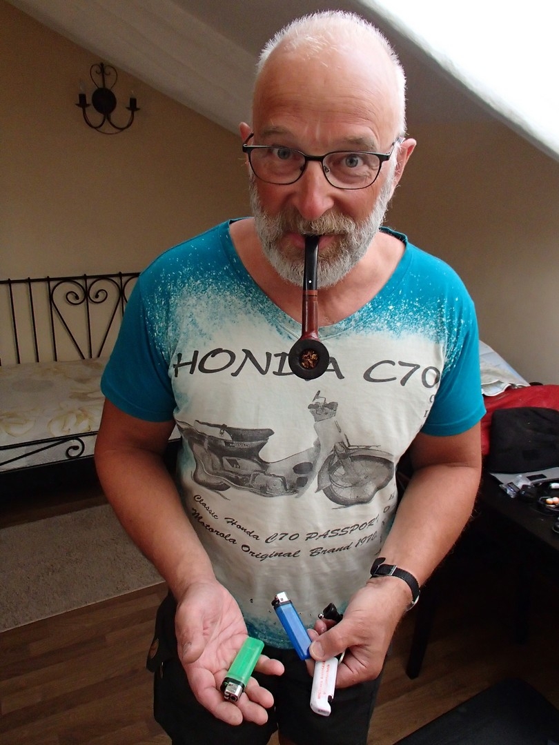 Reinhard kämpfte seit der Mongolei mit einem unzuverlässigem Feuerzeug und ging jetzt auf Nummer Sicher. Wäre ja eine Katastrophe, wenn abends vor dem Zelt die Pfeife kalt bleiben müsste: