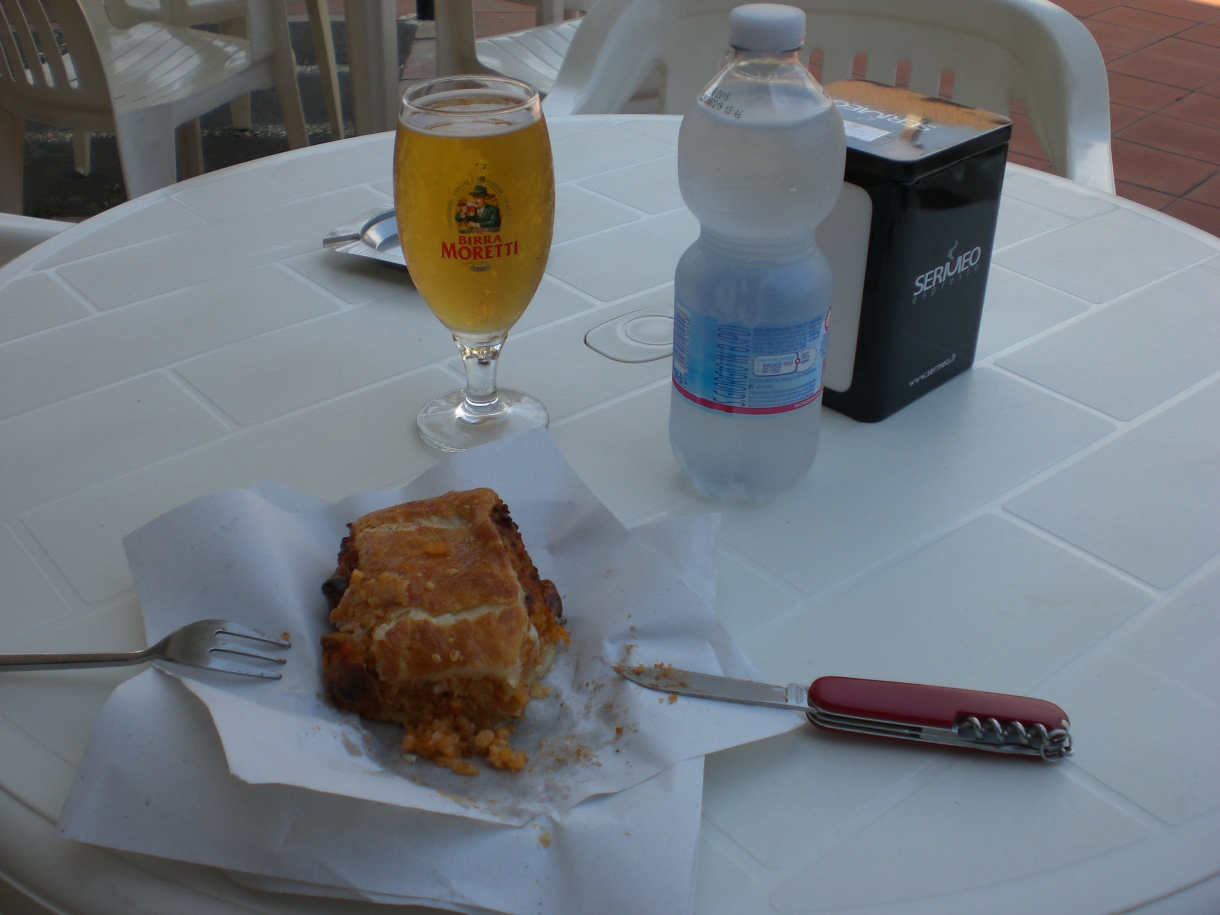 Hole mir die Sachen immer am Tresen ab und setze mich dann draußen hin. Die Teile der "Pasticceria" werden auf Wunsch in der Mikrowelle heiß gemacht. Weil ich die fettigen Hände bei "Fingerfood" nicht mag, weiche ich immer auf das passende Werkzeug (Kleine Kuchengabel und ? ja was wohl) aus, welches stets im Helmfach bei den Schraubenschlüsseln liegt. Mann muß es halt vorher ins´Bier tauchen, damit der manchmal anhaftende WD 40 Geschmack verschwindet. Prost! Gruß Hans.