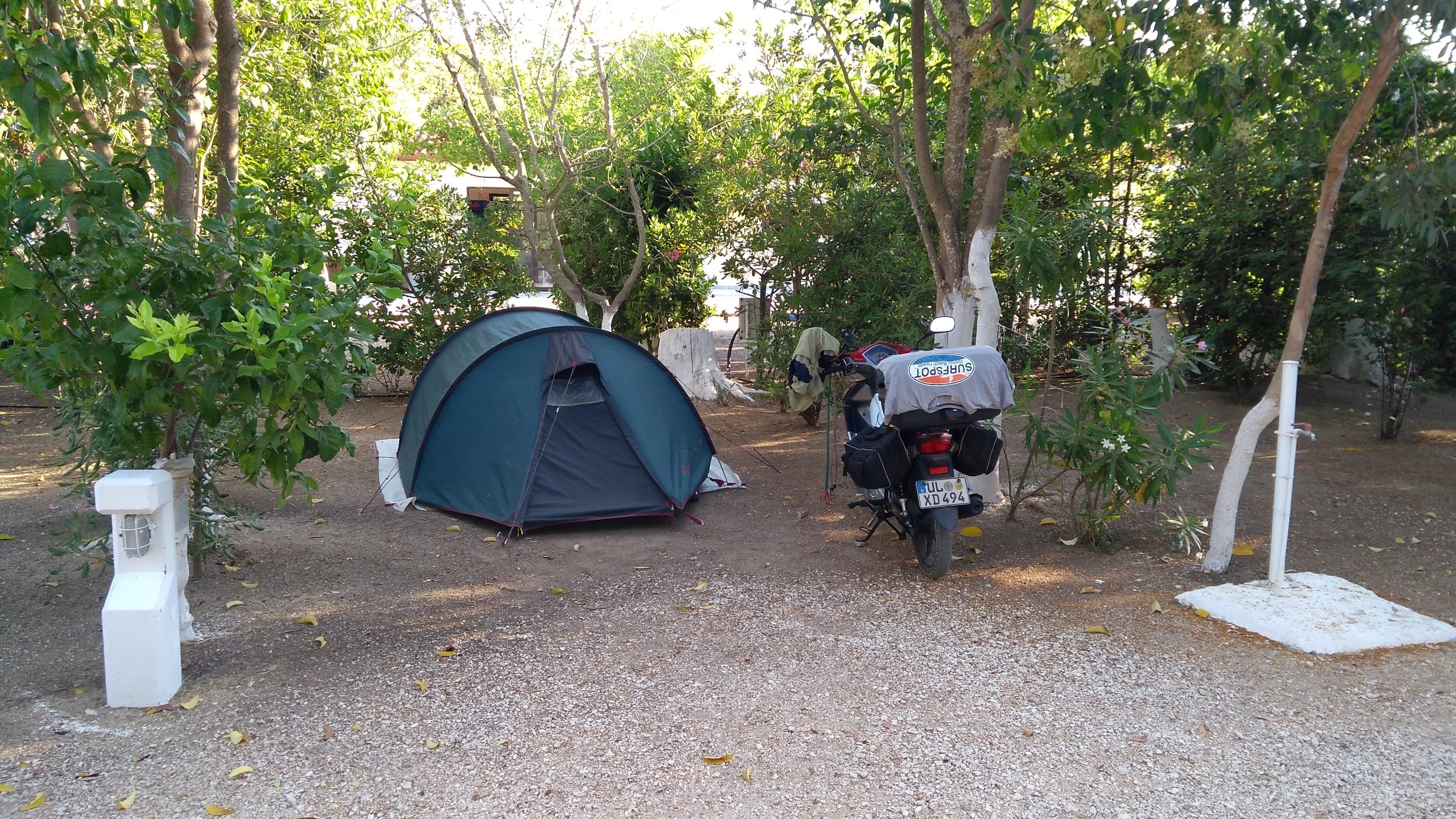 Am Abend fahre ich zum Maragas Camping, bei Dunkelheit schwimme ich dann wieder im Meer. Das Moped darf man dort nach dem Aufbau nicht neben dem Zelt stehen haben. Die wollen nicht, dass der Zeltplatz wie ein Parkplatz aussieht. Neben mir stehen einige Wohnmobile. Nunja, es ist ja nur eine Nacht.