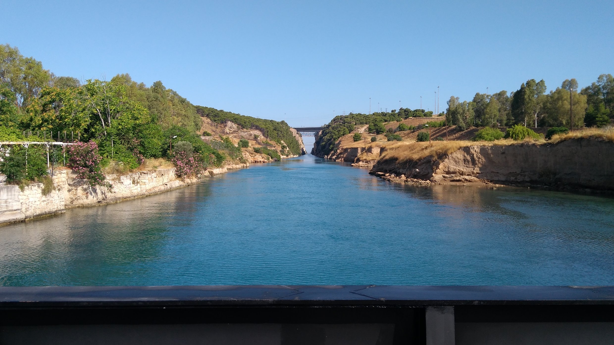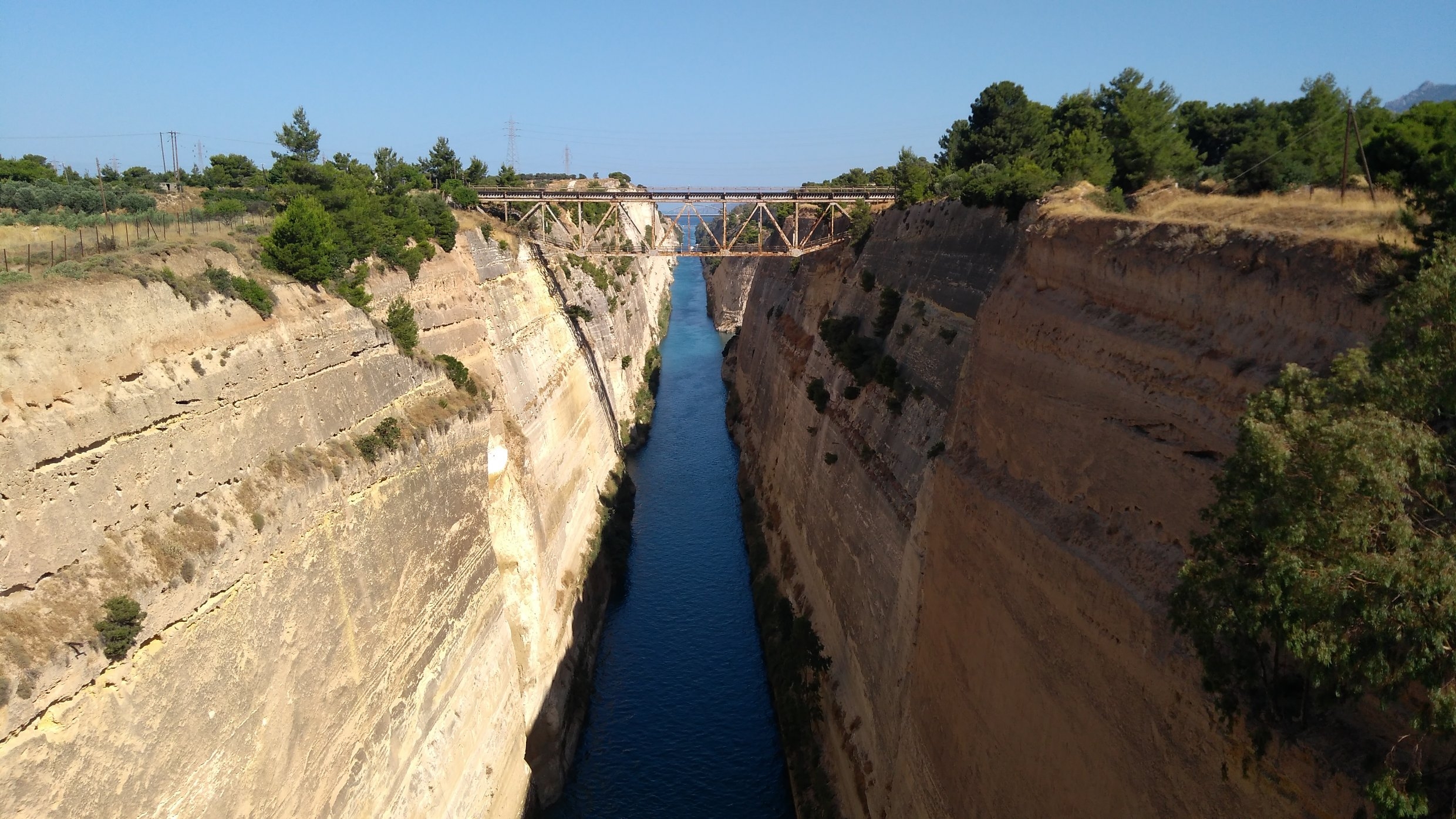 Am Morgen fahre ich zum Kanal von Korinth, erst zu einer kleinen, im Wasser versenkbaren Brücke, danach nehme ich noch die Nationalstraße oben drüber, auf der Brücke ist einiges los.