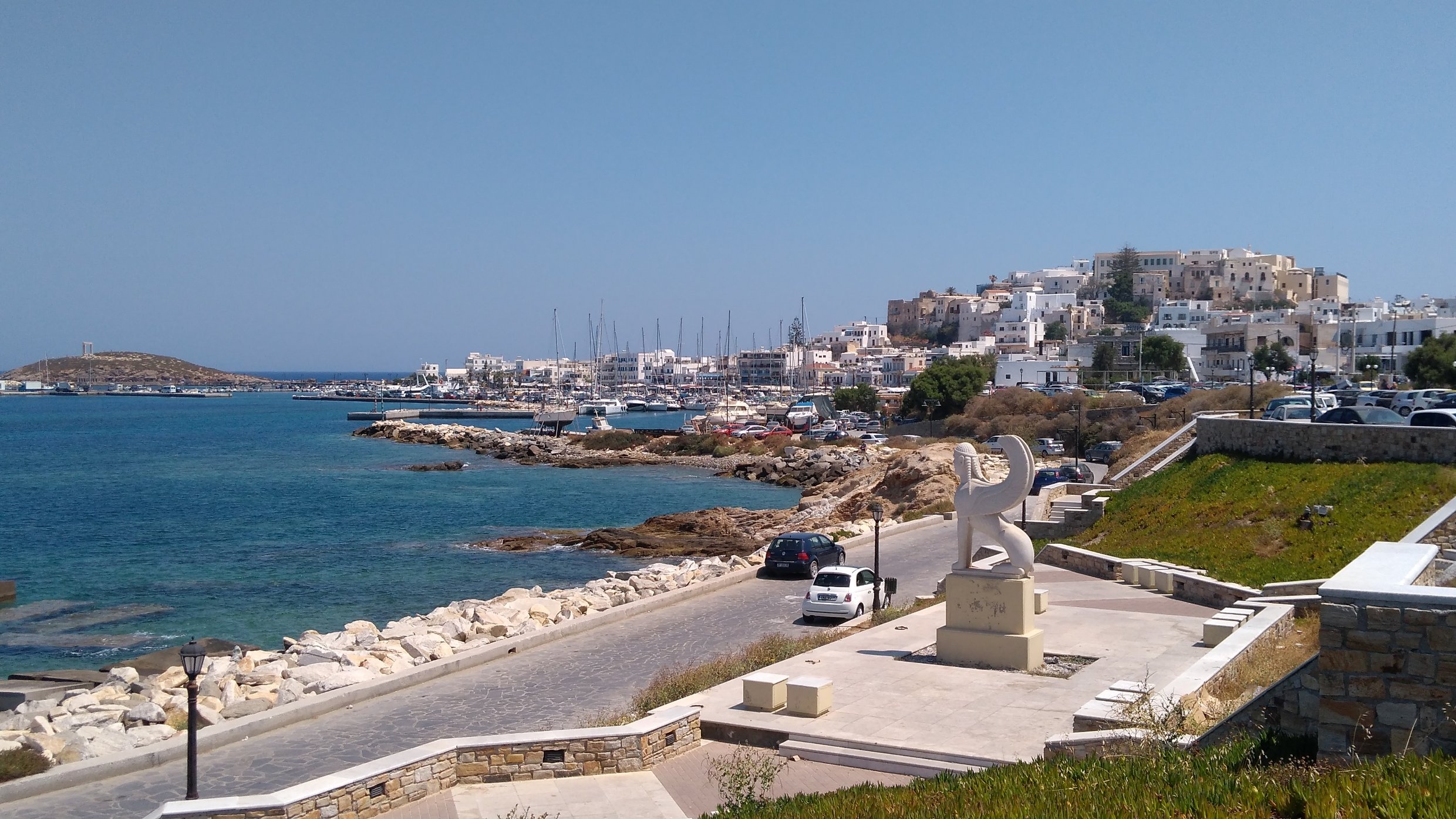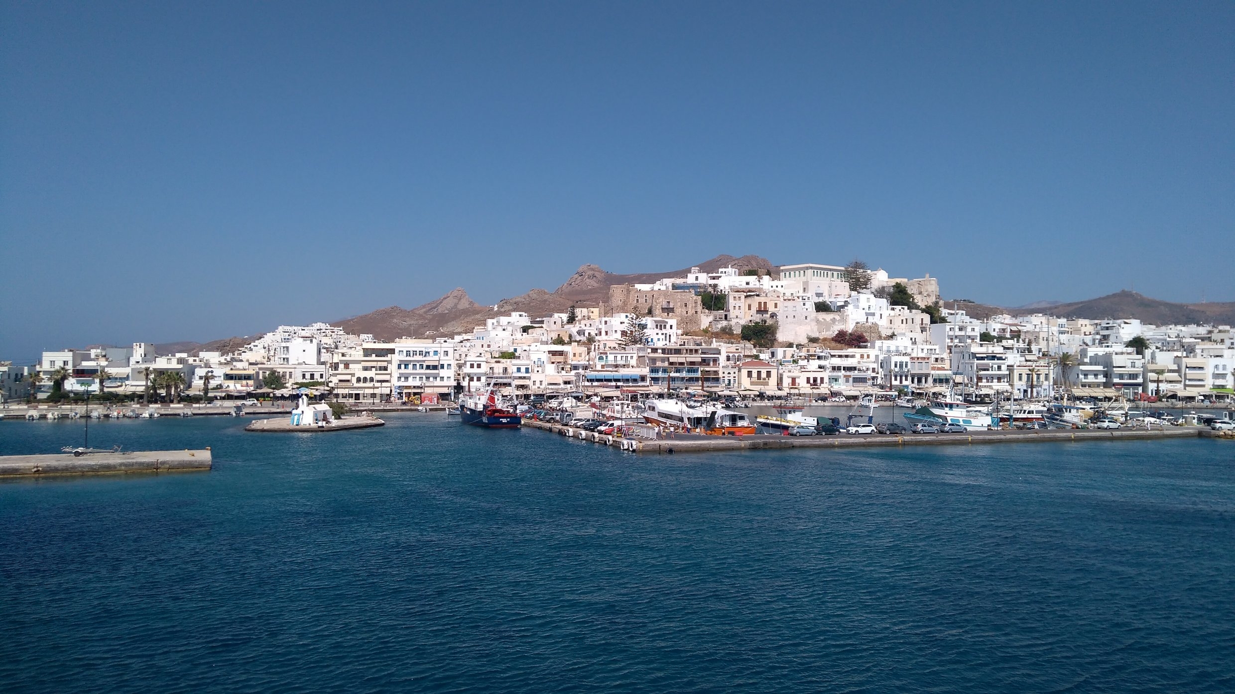 Am Morgen habe ich viel Zeit, meine nächste Fähre kommt erst gegen Mittag. In einer Bäckerei bekomme ich ein üppiges warmes Sandwich aus dem Sandwichmaker, dazu einen Frappé. Die restliche Zeit fahre ich noch etwas durch Naxos Stadt.