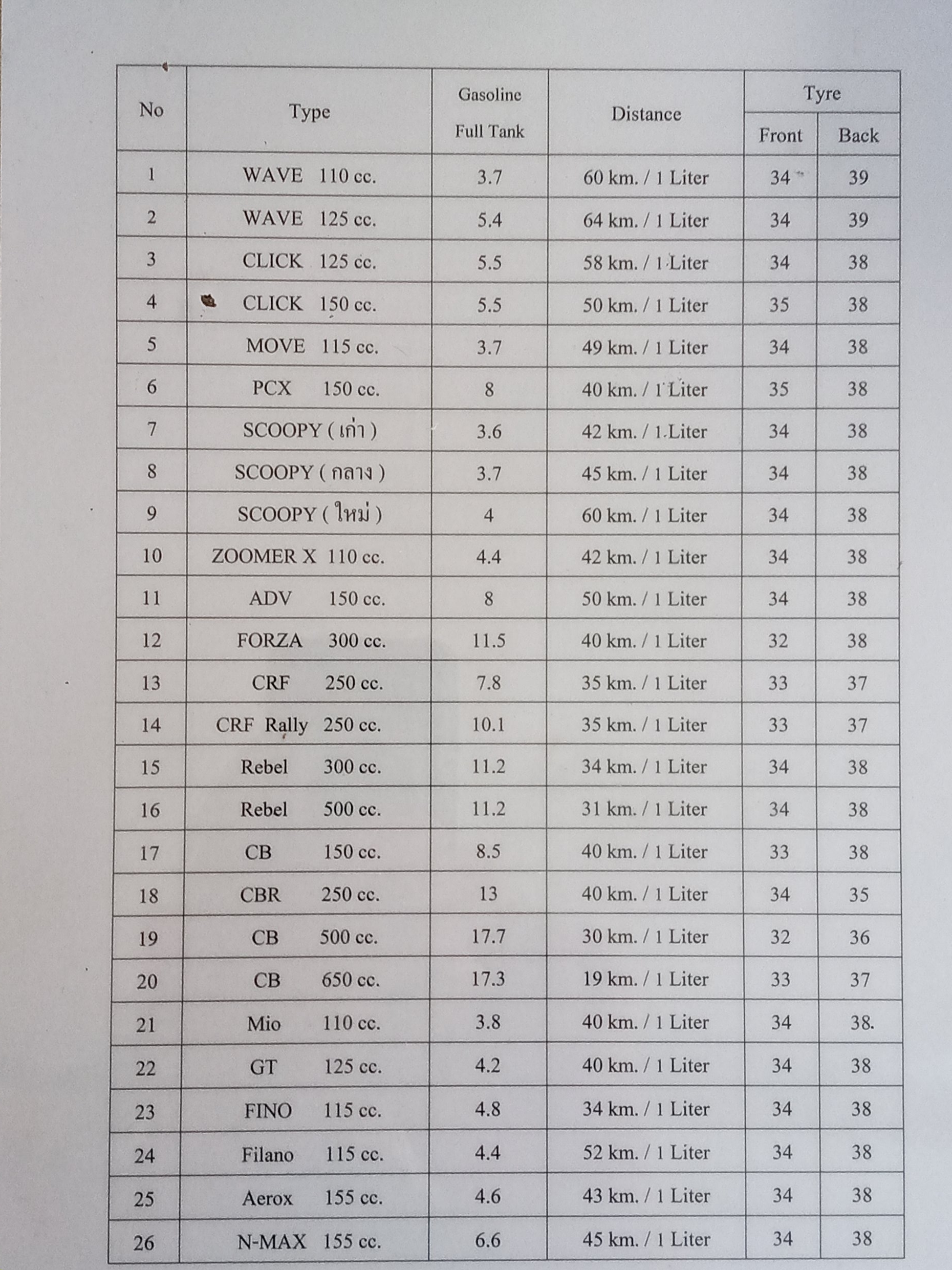 Hier noch, für die, die es interessiert, eine Liste mit Verbrauchsangaben der Modelle meines Mopedverleihers: