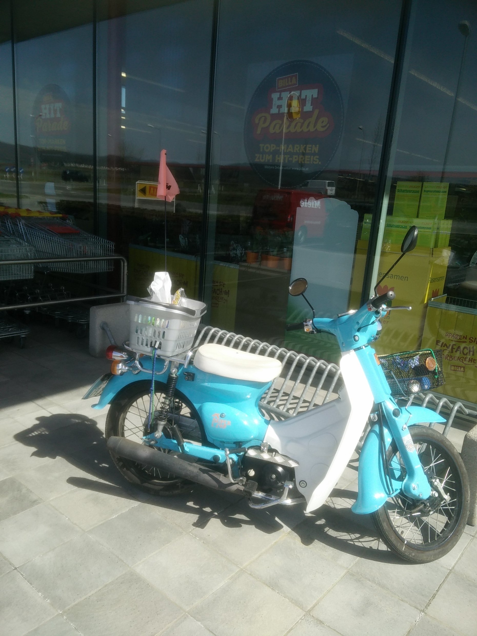 Nachdem ich mir erstmal einen neuen Helm, meinen geliebten Nolan N40, gekauft habe, dachte ich, schaue ich doch mal im Monkeyshop vorbei, bei dem man die SuperCub ja auch auf der Internetseite sieht. Auch mit der Überlegung, vielleicht hat er ja auch was gebrauchtes für mich. Das hatte er leider nicht, eine neue Super 110 wäre noch im Angebot, allerdings für 2.000 €, das wollte ich dann doch nicht. Aber dafür habe ich halt die Super Cub geordert