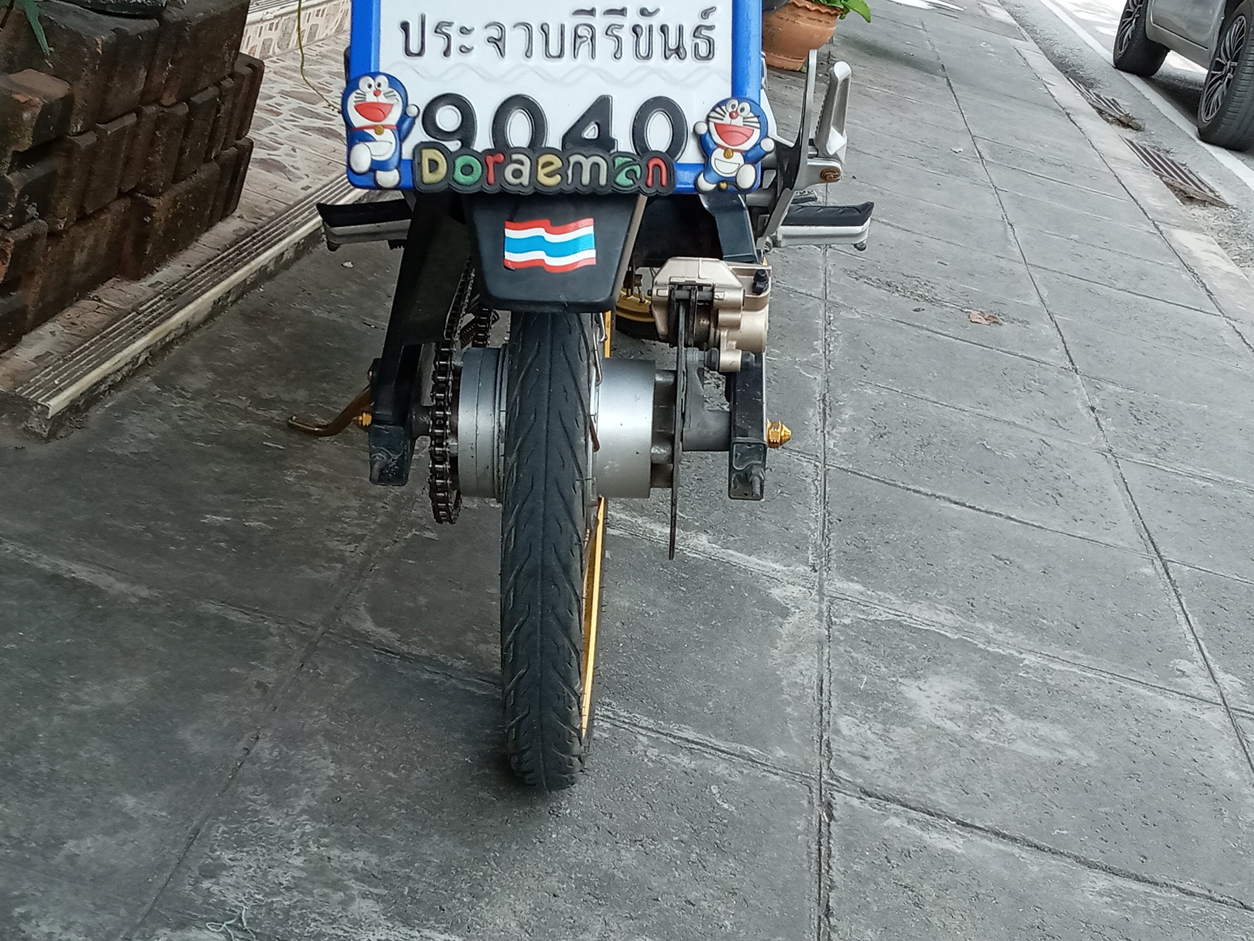 Ich gehe mal davon aus, daß es Naben von einem anderen Rollermodell sind, ev. Honda Click Speiche. Der hat ursprünglich 14 Zoll Speichenfelgen. Das dann umgespeicht auf die schmale 17 Zoll Felge mit entsprechend dünnem Reifen paßt so grad eben in die PCX Schwinge.