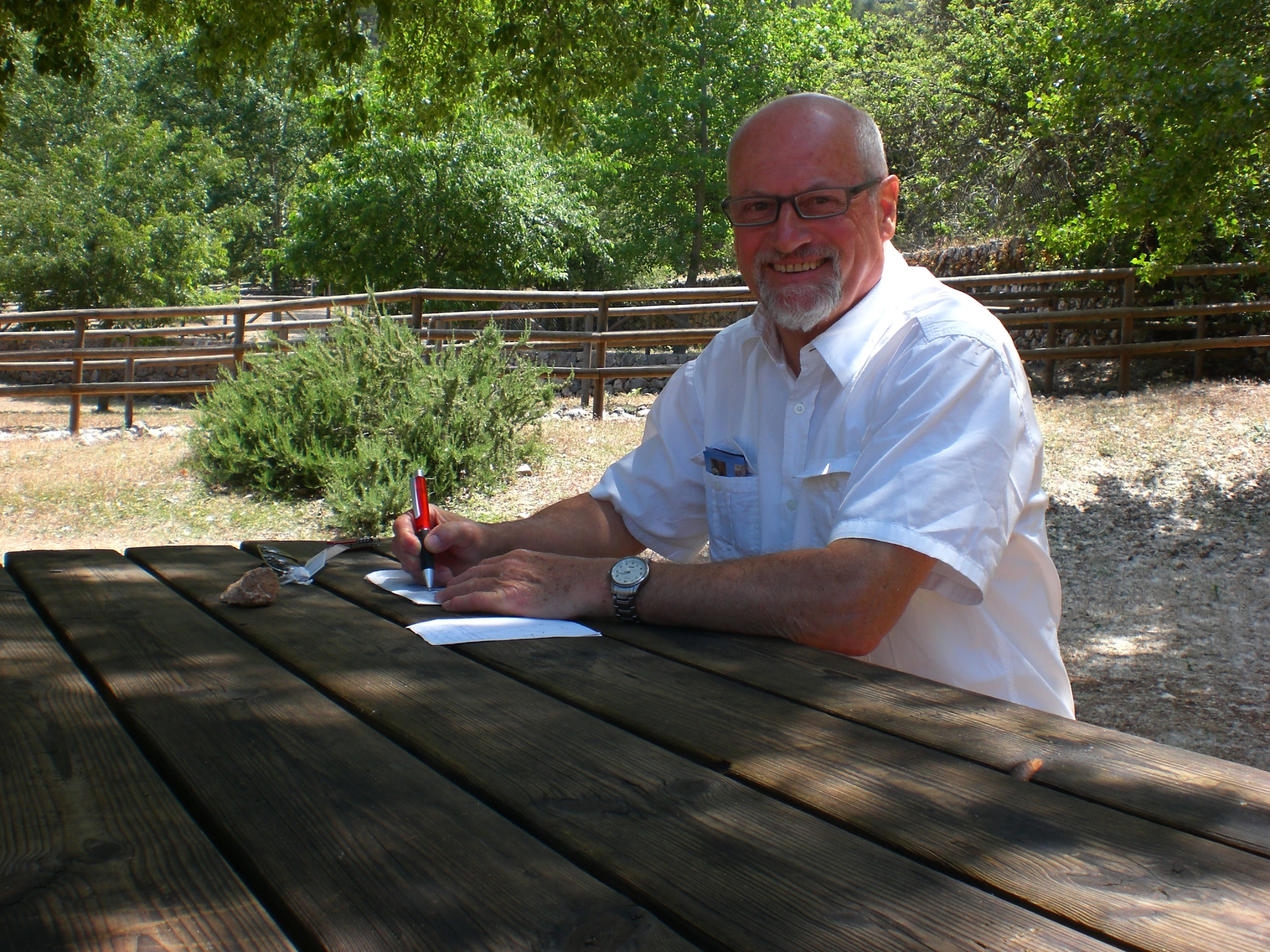 Für die neben mir zeltenden Maquorkiner wird es Zeit für die Abreise. Ihr Weekend neigt sich dem Ende zu. Dies erledigen sie unter Lachen und lauten Zurufen. Die Melodie eines schnell gesprochenen Spanisch erinnert mich immer etwas an das Staccato einer Maschinengewehrsalve. Meine Siesta ist definitiv schnell zu Ende. So mache ich eine zeitlang im Liegen Dehnübungen auf meiner Luftmatratze. (Die Salbe soll ja wirken). Einigen Leuten, welche von meinem Vorhaben Wind bekommen haben und mich darum baten -unter anderen auch eine Schulkameradin aus vergangenen Zeiten-, schreibe ich dann die guten alten Postkarten auf einerTisch-Bank-Kombination, (Eine Konzession an die Wanderer mit und ohne “moto”) mit welcher der Platz zum Glück, gut ausgestattet ist. Um das Kloster herum sind viele Wanderwege.