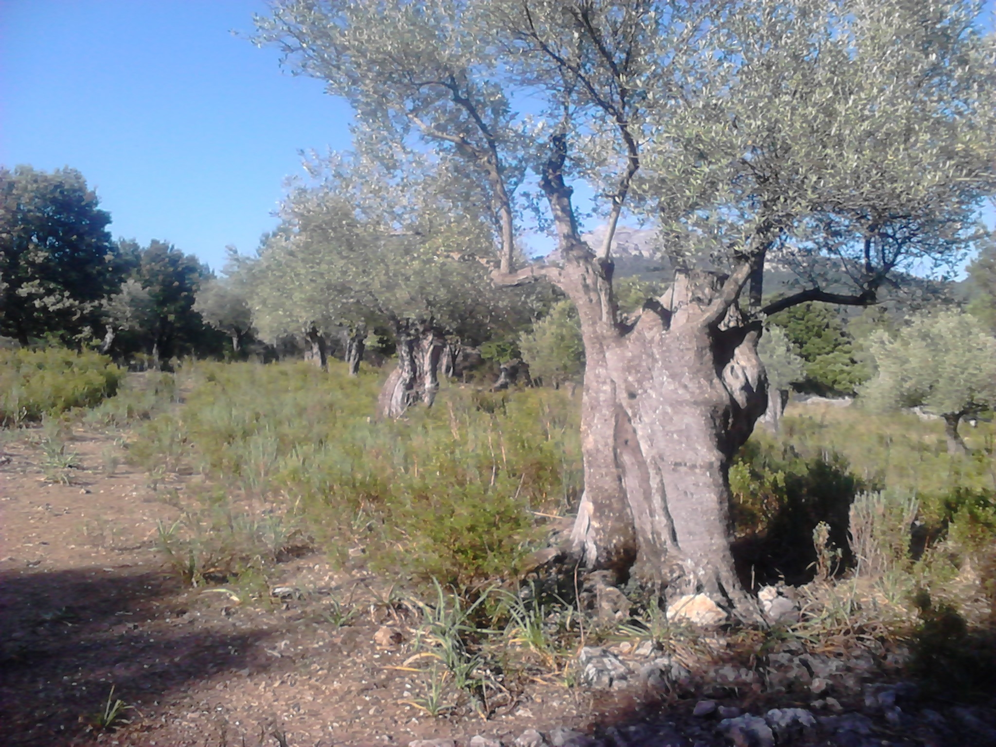 Das verführt noch zu einen Abendspaziergang den Berg hinauf in die Richtung in welcher mich heute vormittag das Wandererpärchen verlassen hat. Dieser Weg besteht aus einem ehemaligen Wirtschaftsweg, gesäumt von mühsam mit der Hand aufgeschichteten Trockensteinmauern um den Hang zu stützen und so eine Bearbeitung des Bodens möglich machend. Auf den schmalen, ebenen Flächen stehen noch Olivenbäume. Ich schätze ihr Alter auf 250 – 300 Jahre. Allerdings nicht mehr genutzt. Ihnen fehlt der Schnitt. Diese Ecke ist nun Naturschutzgebiet. Langsam, aber stetig holt sich die Natur Stück für Stück das ihr abgerungene Kulturland wieder zurück.