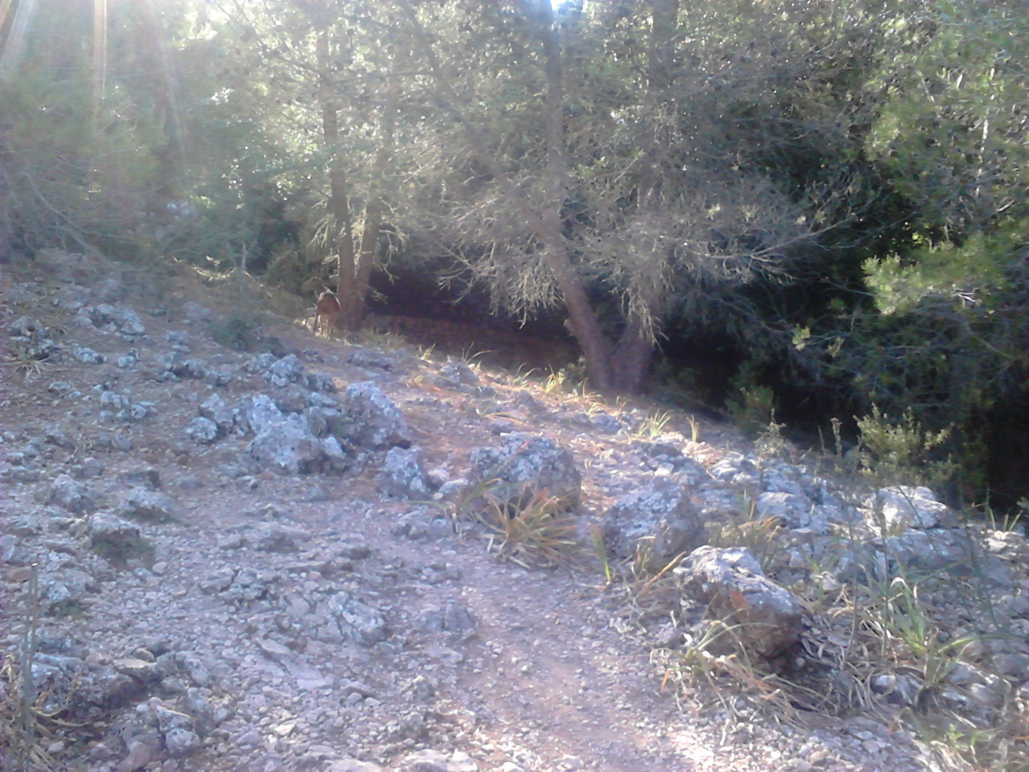 Plötzlich ein gut hörbares Steinerollen in der schon fast gespenstig anmutenden Abendstille. Bleibe stehen und schaue mich um. Von einem vorspringenden Steinhaufen einer verfallenen Mauer glotzen mich die viereckigen Pupillen eines Ziegenbockes neugierig an. Wir beobachten uns. Nach einem freundlichen Gruß in schwäbisch meinerseits erwiderte er den Gruß in internationalem Meckern und wendet sich wieder seinen Geißen und dem Abendessen zu. Hier leben (halb)-wilde Ziegen! Sicher gibt es auch noch frei laufende Wildschweine. Etwas lauter als sonst pfeifend trete ich den Rückweg an und steige mittels einer Leiter über den Zaum zurück in die Zivilisation.