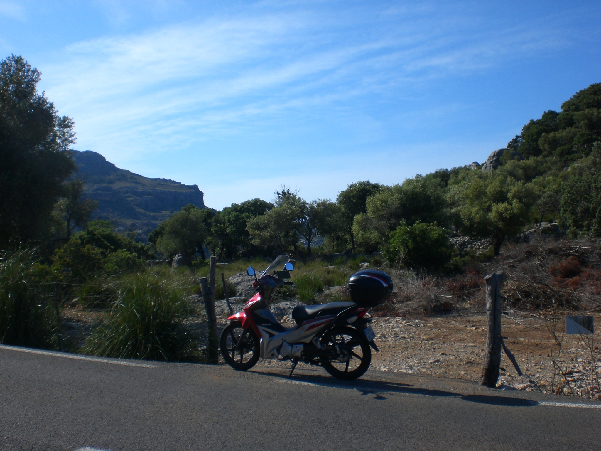 Losgelöst von schwerem Gepäck und schwerer Kleidung flog die Kleine nach dem Warmlaufen wie ein Pegasus den Paß hinunter nach Sa Calobra. Schön die Kurven durchschwingen. Super Handling die “Lady”. Jetzt nur nicht übermütig werden. Prompt kommt mir auf meiner Spur ein “Dickschiff” entgegen. Wir sind beide erschrocken und konnten die Situation klären, wenn auch mein Puls im Ultraschallbereich klopfte. An die Seite fahren, absteigen, mit dem Bein gegen das nächste greifbare Teil kicken, laut, nicht wiedezugebende Worte schreien, teif durchatmen, aufsitzen und es wieder versuchen. Jeder Landschaftswechsel wird mit einem anderen Geruch angekündigt. Heugras. Pinien. Ziegen. Lastwagenabgase. Das Meer. Weiter nach Soler und Valldemossa, wo es der gute Chopin von George Sand so richtig gezeigt bekam. Ihr und ihrem Sohn hat das Klima gut getan. Chopin nicht. Er bekam Lungenentzündung und nach ca. 100 Tagen war das Intermezzo gegessen.