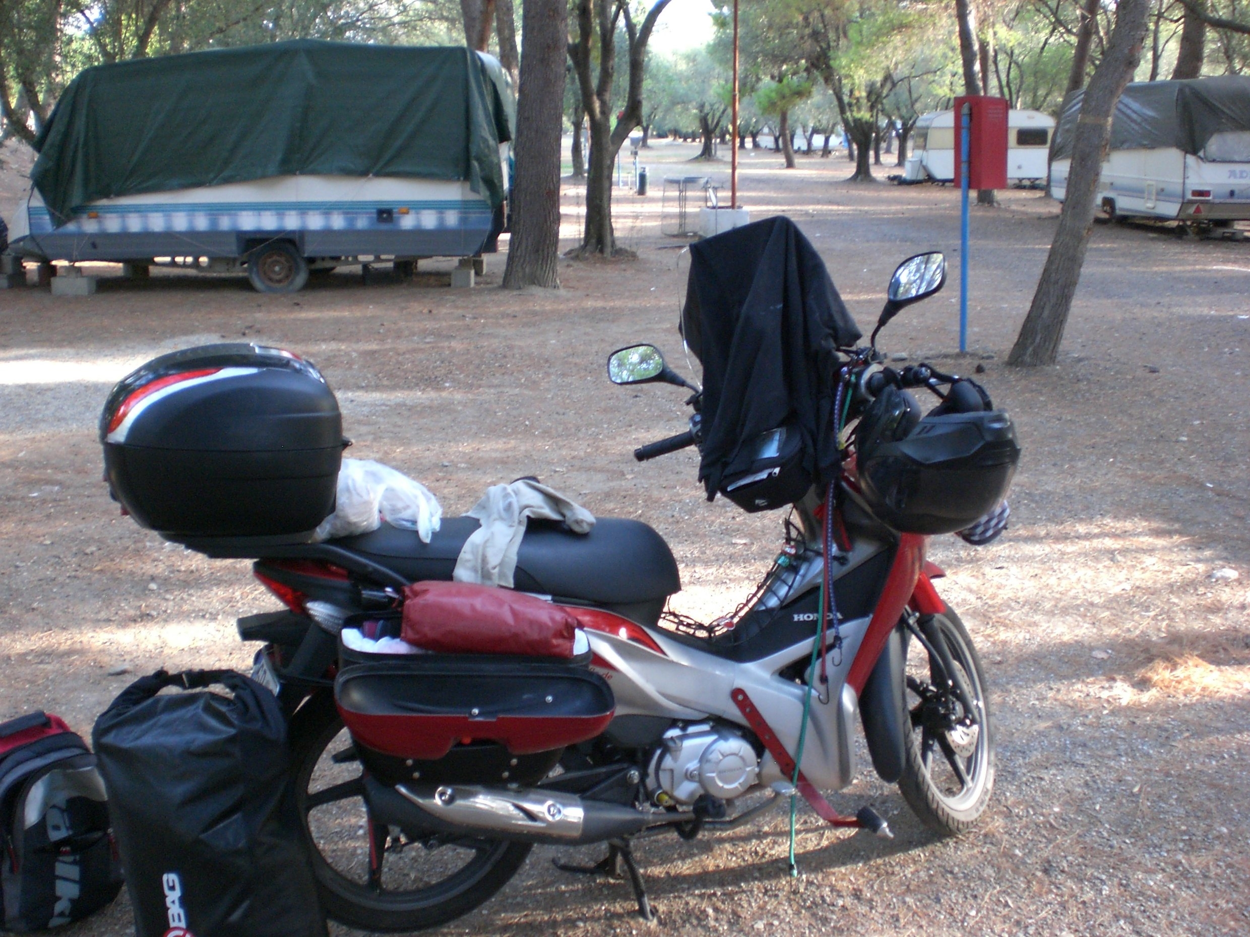 Wenn ich mit dem Auto campiere, früher im Zelt, jetzt im Bus, dann bewundere ich die Jungs, ganz selten sind auch Mädels mopedmäßig unterwegs, die mit ihren Motorrädern und Zelt die Welt bereisen. Und, je kleiner das Motorrad, desto bewundernswerter.