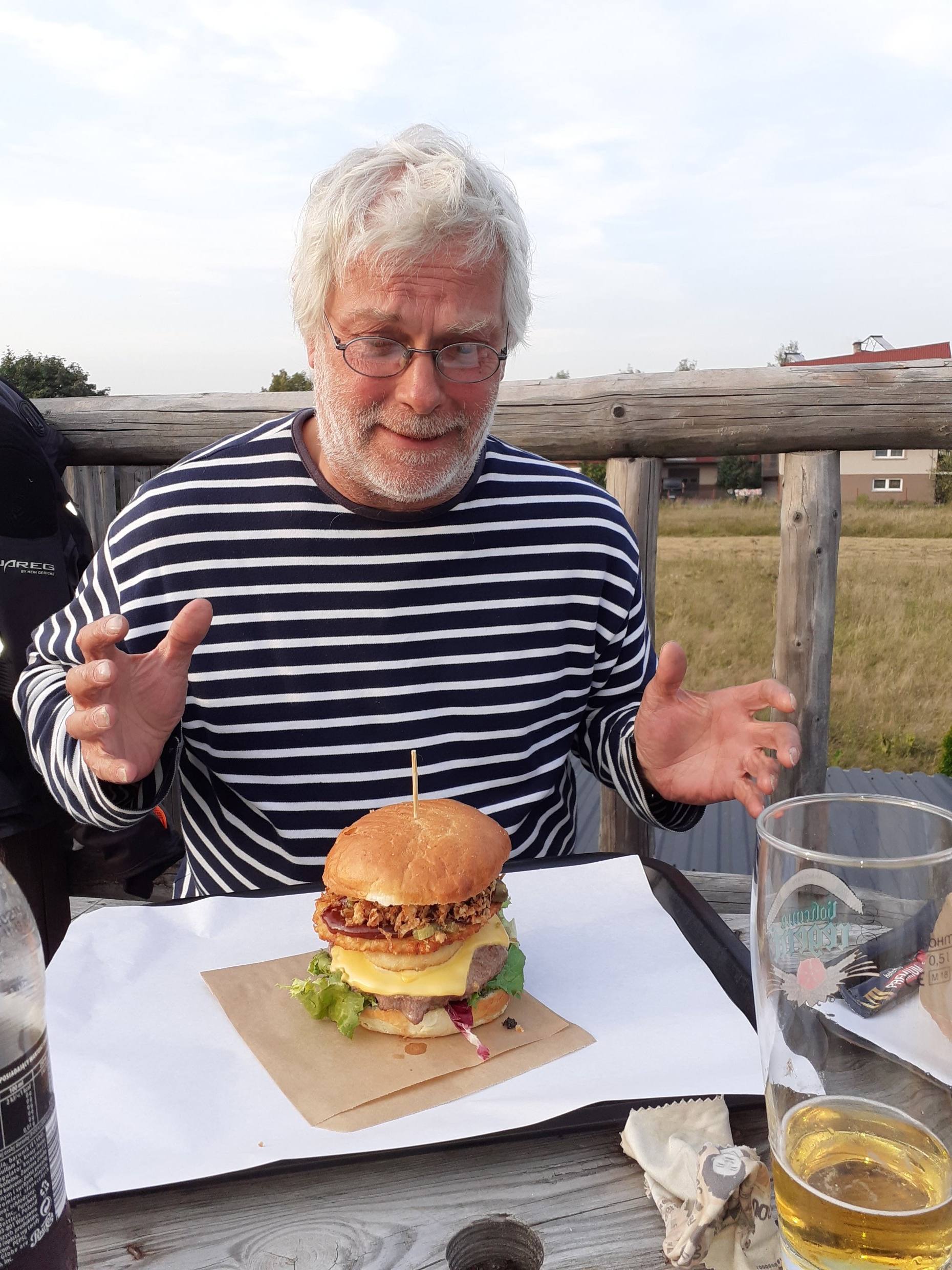50 km weiter wurde es wieder ruhig und wir fielen in einer "Burgery" für ein Monsterexemplar ein. Abends wurde es dann nochmal hektisch. Harri war des Zeltens müde und wollte ein Bett. Kurzerhand buchten wir in der Dämmerung am Straßenrand was mit dem Smartphone. Erst nach der Bestätigung merkten wir, daß es erstens 70km entfernt und zweitens in Tschechien war. Also noch anderthalb Stunden Stockdunkelrennen durch Wälder und Auen, bis wir um 22 Uhr kurz vor Meldeschluß noch ein grandioses Apartment beziehen und ein Abendbier genießen konnten. Die Innokette klapperte auf den letzten Kilometern schon hörbar im Kasten. Heute geht es zurück nach Angelistan...
