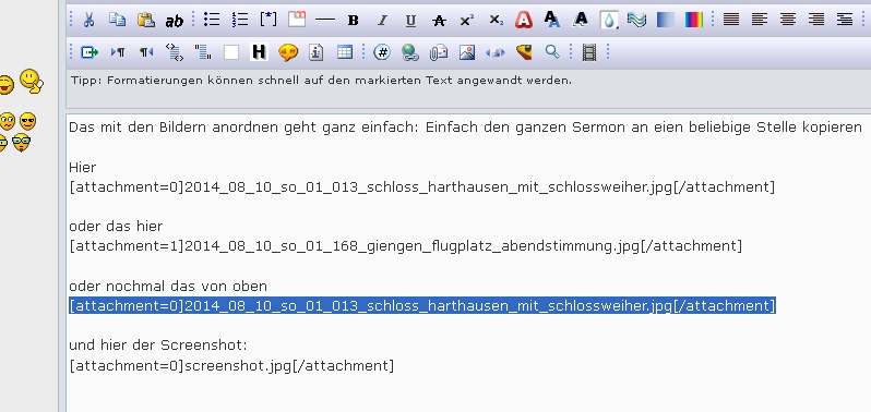 Das mit den Bildern anordnen geht ganz einfach: Einfach den ganzen Sermon an eien beliebige Stelle kopieren