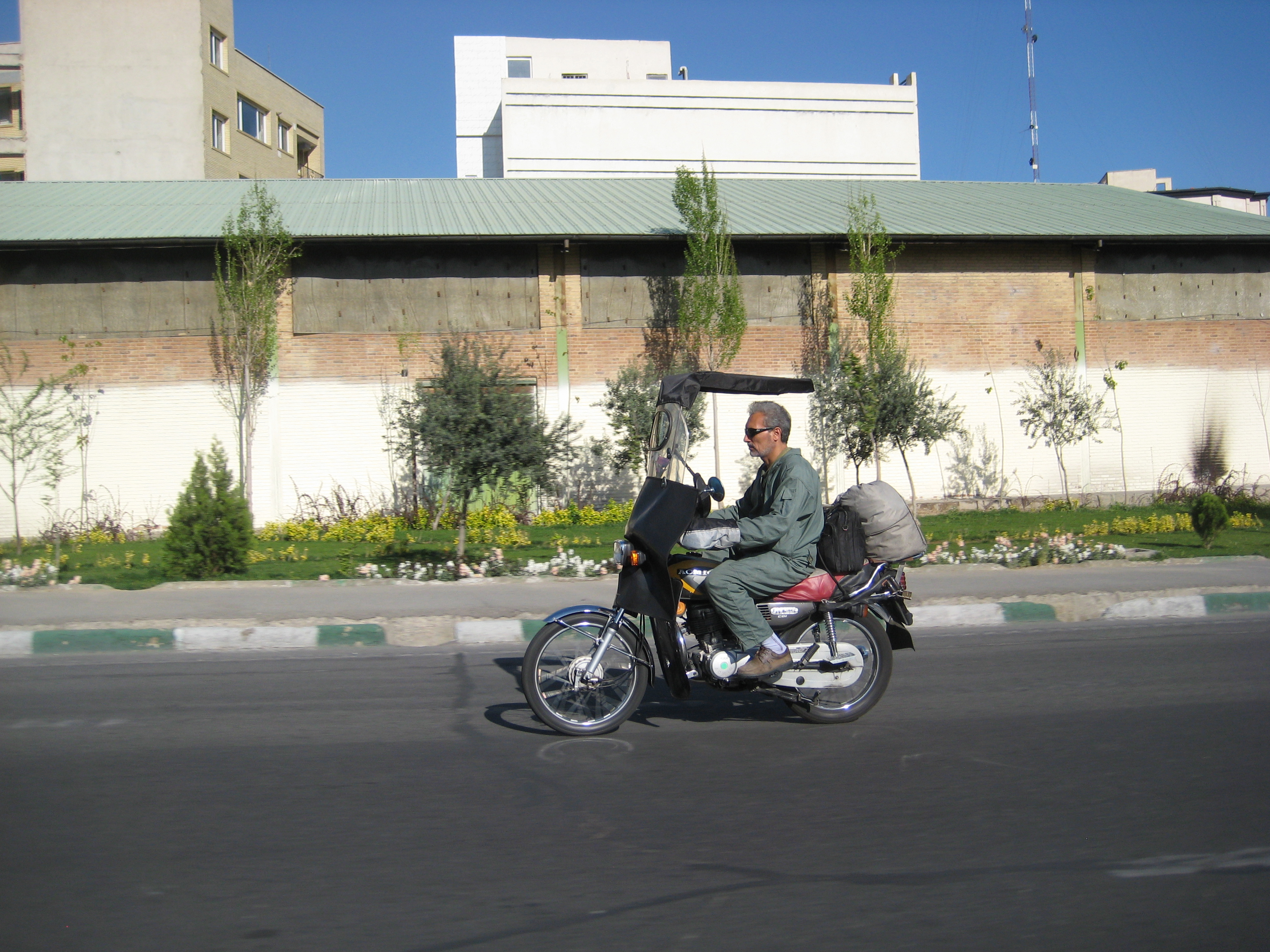 Ihr wollt nun sicherlich ausschließlich Mopedgeschichten aus dem Iran hören. Gut - auffällig ist: es gibt fast nur 125er 4-Takter, viele Cubs, dann Lizenzbauten der Honda CG125 mit einem iranischen Motor. Große Maschinen sind nicht erlaubt im Iran. Grund: die Gegenrevolution gegen Chomeini 1979 wurde u.a. von Leuten auf schweren Motorrädern durchgeführt und diese waren vermutlich aufgrund der Schnelligkeit und Wenigkeit nicht zu fassen. Seither stehen die 1000er Yamazukis sich die Reifen bei Sammlern in Kellern platt und nur Ausländer dürfen mit Sondergenehmigung auf schweren Maschinen das Land befahren. Ich habe Motorradpolizisten auf 250ern gesehen und auch schon mal eine mit 200ccm ausgewiesene modern gestaltete Maschine. Sogar Taxi-Motorräder gibt es, zumindest in Teheran.