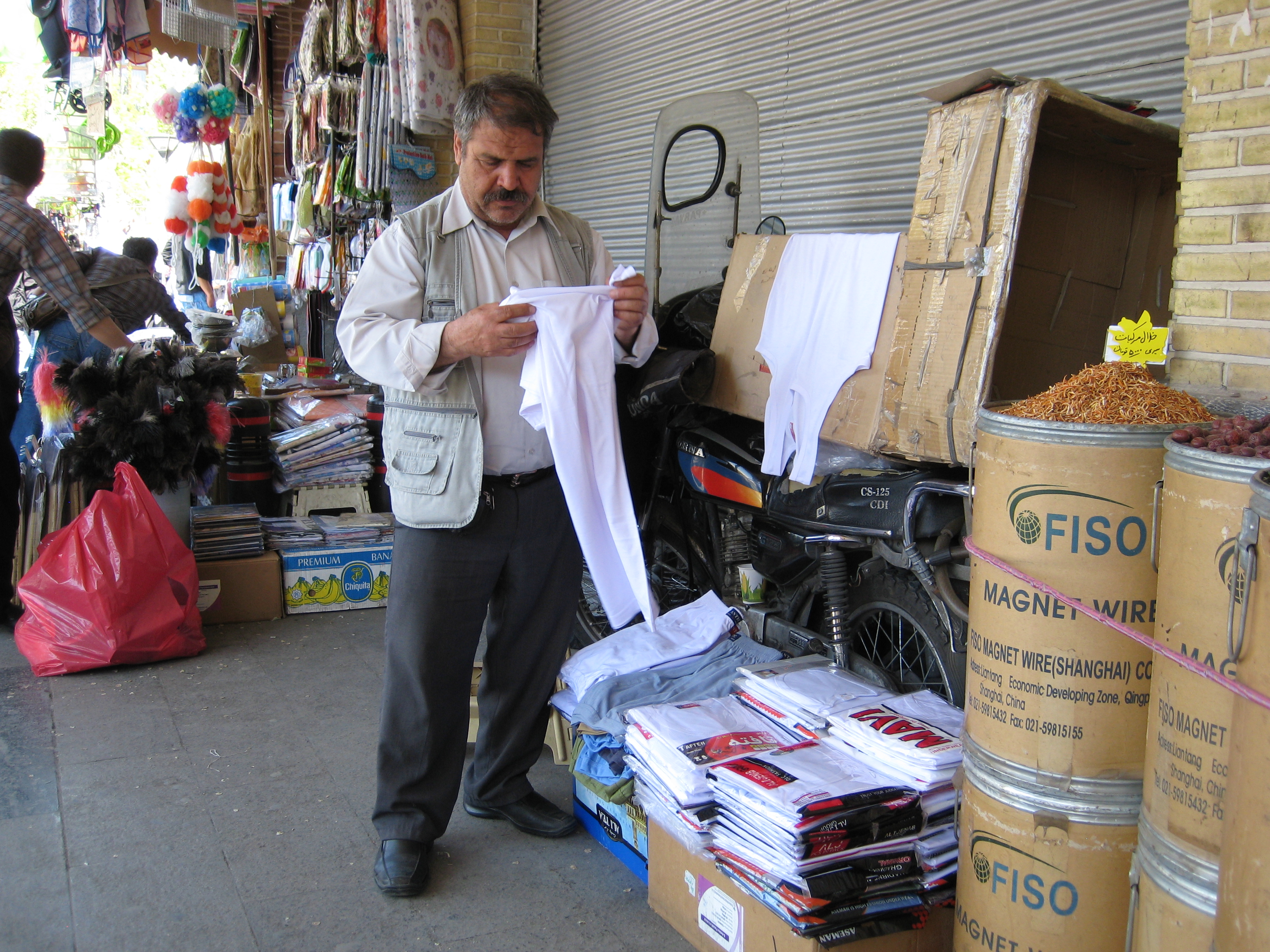 Ja, der Motorrad-Taxistand war interessant. Die Nase von dem Mann mit den zu engen Hosen war wie gesagt abgeklebt. Warum wohl? Im Hintergrund die Chopper war das Polizeimotorrad. Ungefähr das größte Ding, was ich hab rumfahren gesehen. Innova-Raser: mach Du hier mal weiter und kommentiere meine Bilder. Kennst Dich offensichtlich bestens aus! Die "Mühle" mit dem spartanischen Zündkerzenstecker gehörte einem unserer Gastgeber. Das Ding stand verstaubt in einer Ecke und ich hab es mir nicht nehmen lassen, ein paar Startversuche zu machen. Die sind leider an Spritmangel gescheitert, und das im Erdölland Nr. 1 dem Iran. O.K., Zündung war da, Batterie hatte das Ding ggf. nicht, beim Kicken ging aber das Fahrlicht an. Ich denke, die Kiste wäre gelaufen. Funken flog auch sichtbar über. Dafür ist so ein nackter "Zündkerzenstecker" schon ideal. Aber Ihr wolltet ja keine Moped-Geschichten hören, also zurück zu Euren Fragen...
