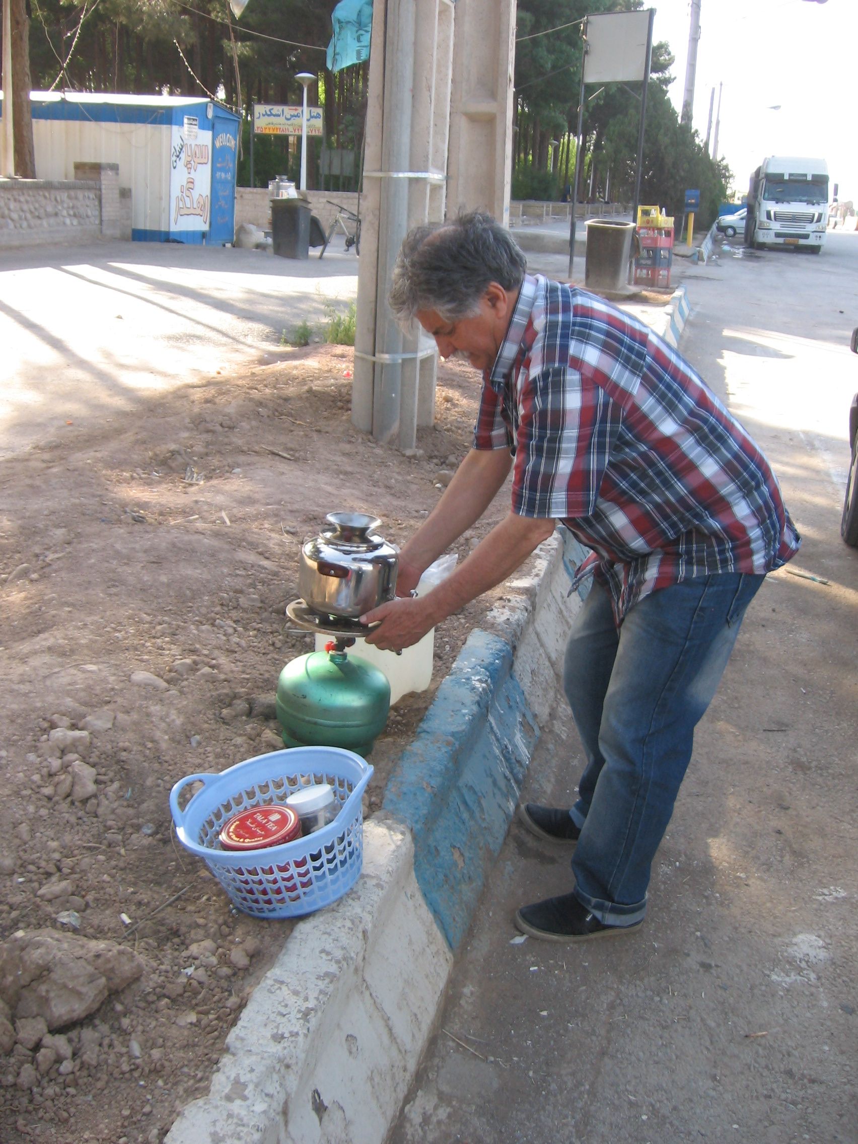 Essen und Trinken: für mich als Ostfriese ist es ja kein Problem, den ganzen Tag schwarzen Tee zu trinken. Obwohl die Iraner in dieser Hinsicht viel extremer sind als "wir". Unser Versorgungsteam aus Teheran hatte sogar Teewasser in Kanistern dabei, um nicht minderwertigeres Teewasser unterwegs nutzen zu müssen. Hintergrund: das Teheraner Leitungswasser ist 1A und kommt direkt aus den Bergen. Hammer: an zentralen Punkten der Autobahn findet man Shops, die draußen vor der Tür einen riesigen Samowar haben, wo sich jeder mit kochendem Wasser kostenlos bedienen kann zum Teemachen, Nescafe, etc. - toll!