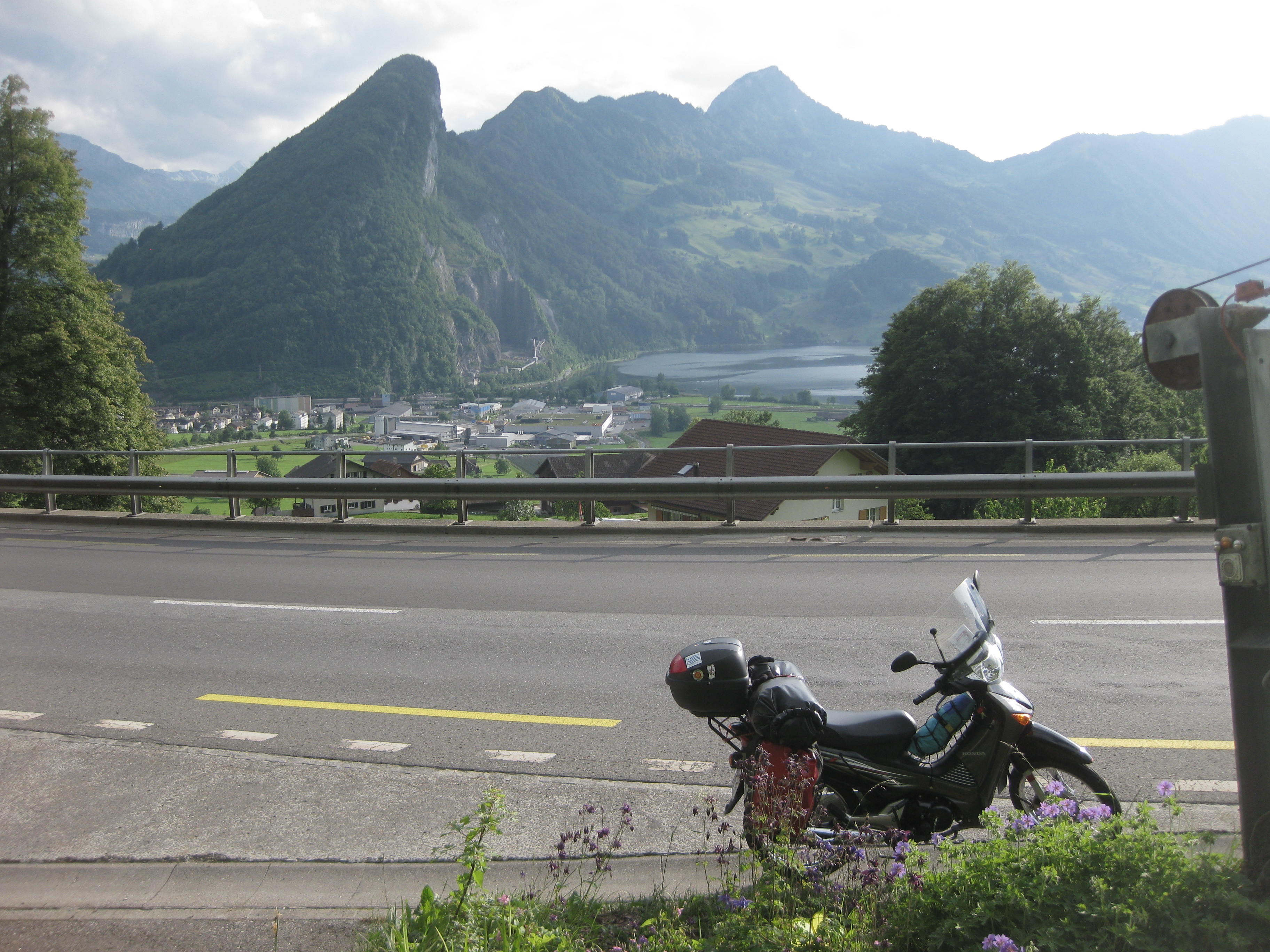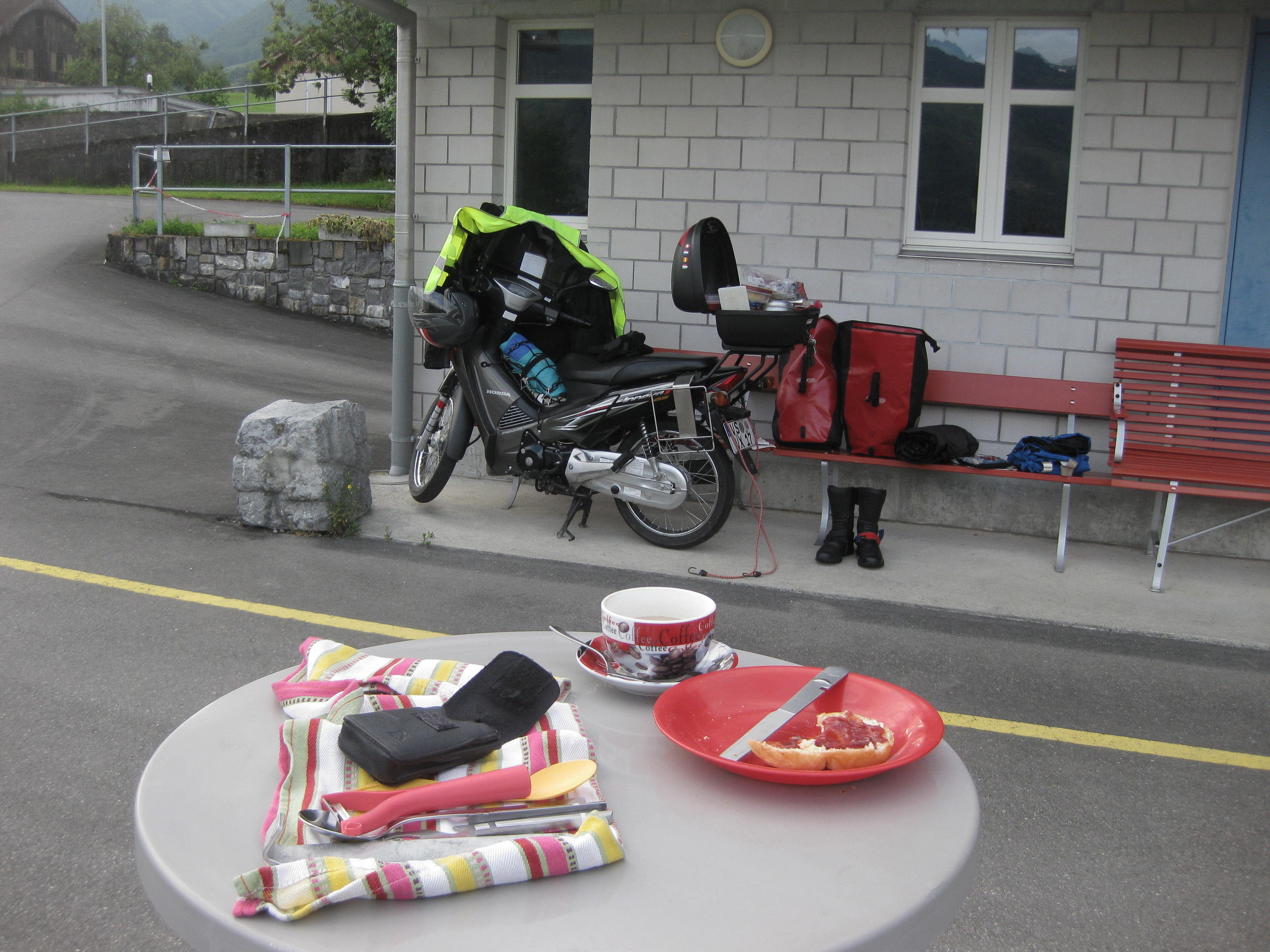 So ganz entspannt ist die Fahrt durch die Schweiz nun wahrlich nicht, schon gar nicht mit der Inno, da ich mich ja nur auf Landstraßen bewegte, musste ich höllisch aufpassen, hier eine Tempobegrenzung auf 70 keine 50 m weiter wieder 60, Ortsdurchfahrten mit 50, wieder 60 ein paar hundert Meter dann die 80, ein dauerndes auf und ab und manchmal konnte ich einfach nicht glauben, dass da immer noch eine Begrenzung sein soll, völlig offene Fläche, aber eine Aufhebung konnte ich mit dem besten Willen nicht finden. Ich habe mir also dreimal überlegt, ob ich den Tacho von 50 km/h auf die 80 km/h "hochschnellen" !!! lassen soll, denn wenn man mit dem PW schon einmal 500 Stutz gezahlt hat, geht man lieber auf Nummer sicher. Aber das ist eine andere Geschichte. Billig war die Schweiz ja noch nie aber im Moment ist es schon eher übel, Camping mit dem (kleinen) Zelt 25 Sfrs, zwei Kaffee mit Brötchen und Marmelade, Butter hatte ich selbst in meiner Küche in der Topbox 13 Sfrs = 13 €. Lichtenstein ist auch nicht besser, Flammen-kuchen einfachste Art und eine Stange Bier 25 Sfrs = 25 €. Aber was wollen wir, mit der Inno fahren wir die Tour mit fast 900 km und bezahlen 25 €, da hat Camping, Kaffee und Essen schon noch Platz - in der Hoffnung, dass der Preis nicht noch durch eine Busse hochgetrieben wird.