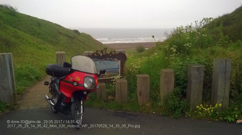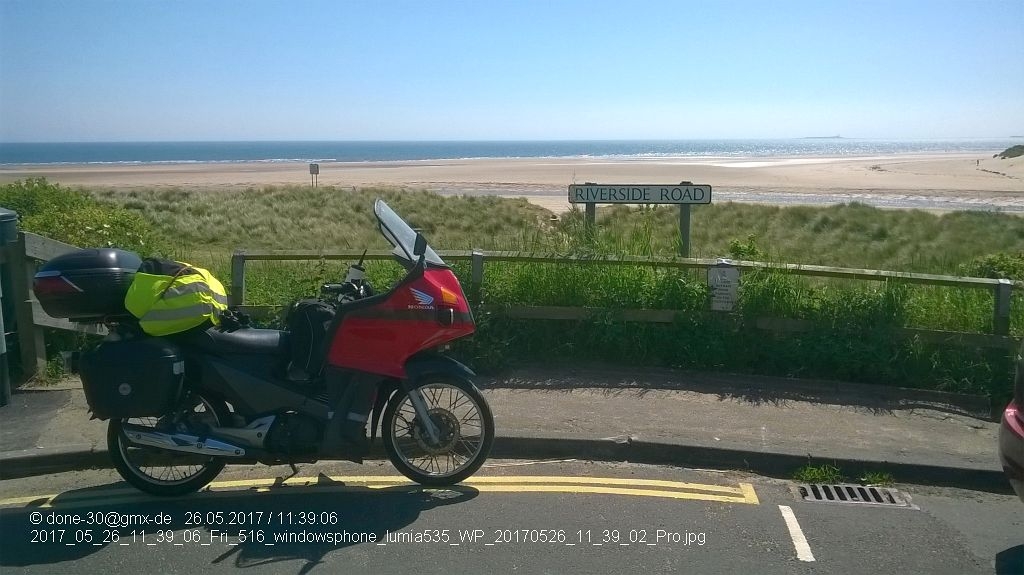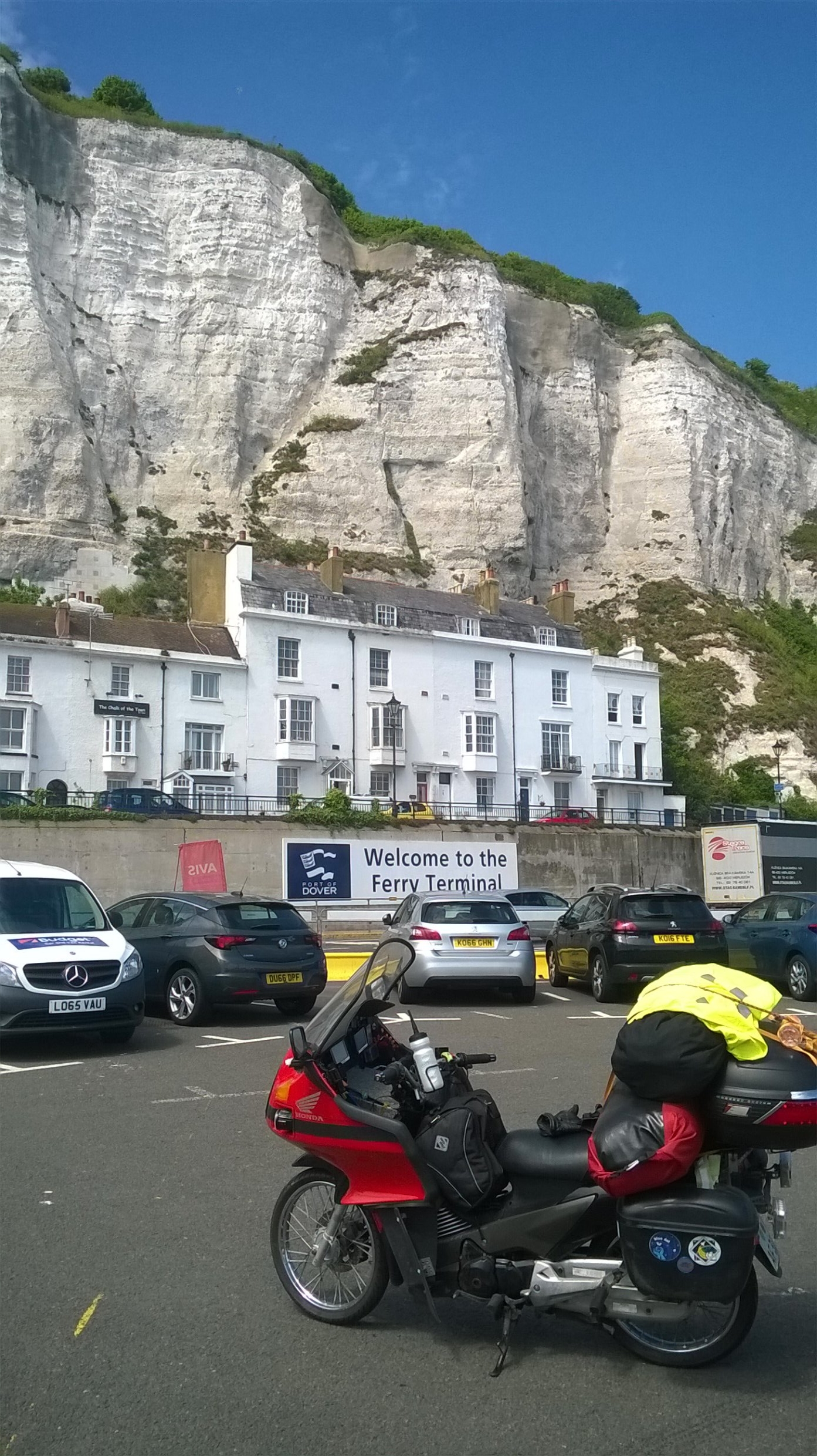 Morgens um halb sieben aufgewacht, zufällig die Buchung der Fähre angeschaut und gestutzt: Ich fahr gar nicht von Dünkirchen, sondern ab Calais. Also knapp ne Landstraßenstunde länger. Check-In spätestens 13:30 Uhr. Mist, also ohne Frühstück raus und knacken lassen, besonders Stadtverkehre meiden, rauf auf die Dosenbahn um Antwerpen. Klasse Idee im montagmorgentlichen Berufsverkehr. Zäh, aber es lief. Naja, bis sich weit voraus Einige nicht einig waren. Leider Vollsperre, da kommst halt nicht raus, selbst mit dem Moped nicht. Hab da ca eine Stunde verloren, also auf der Dosenbahn bleiben. Um Gent und Brügge sah die spärlich bis nicht vorhandene Landschaft auch nicht unbedingt serpentinenlastig aus. Also die Inno schnurren lassen. Unterwegs Kaffee und Gebäck gegen die Langweile und Unterzucker. Luftdruck hinten etwas nachfüllen und ein kleiner Schluck Öl. Bei Dünkirchen hatte ich soviel Zeitpuffer, dass ich mir als historisch interessierter Mensch einen schnellen Blick zum Strand gönnen konnte. Am Strand entlang viele Tempo 30 Zonen und getrödelt, also zurück auf die Bahn. Vor Calais nochmal kontinentalen Sprit gebunkert, dass ich nicht unmittelbar nach der Überfahrt meine Pfunde raussuschen muss.