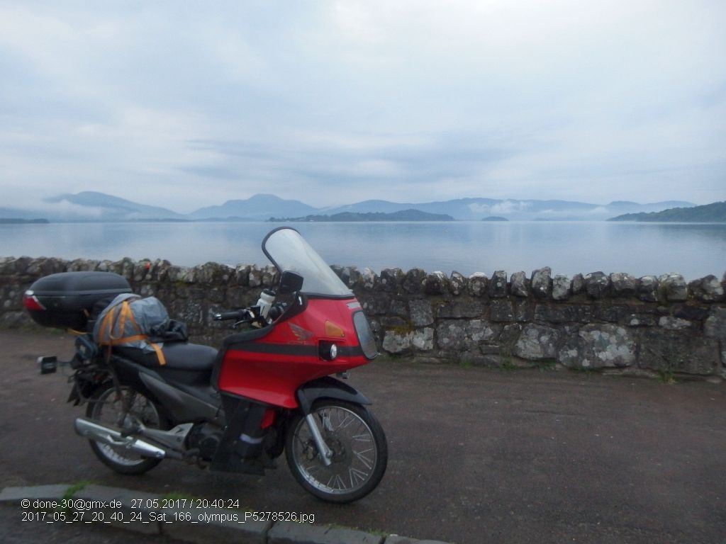 Dann rüber den Tay hoch am Loch vorbei zum nächsten Loch, dem Lomond. Endlich wurde das Wetter schottisch. Ein paar Tropfen hab ich abbekommen, aber meist fuhr ich dem Regen hinterher. Das meiste Wasser was ich abbekam war von der grünen Tunneldecke getropft, also den Bäumen.