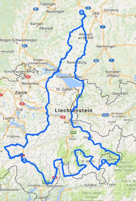 Über Biberach runter nach Bregenz, durch Liechtenstein nach Landquart, weiter nach Klosters, kurze Präsentationsrunde durch Davos.