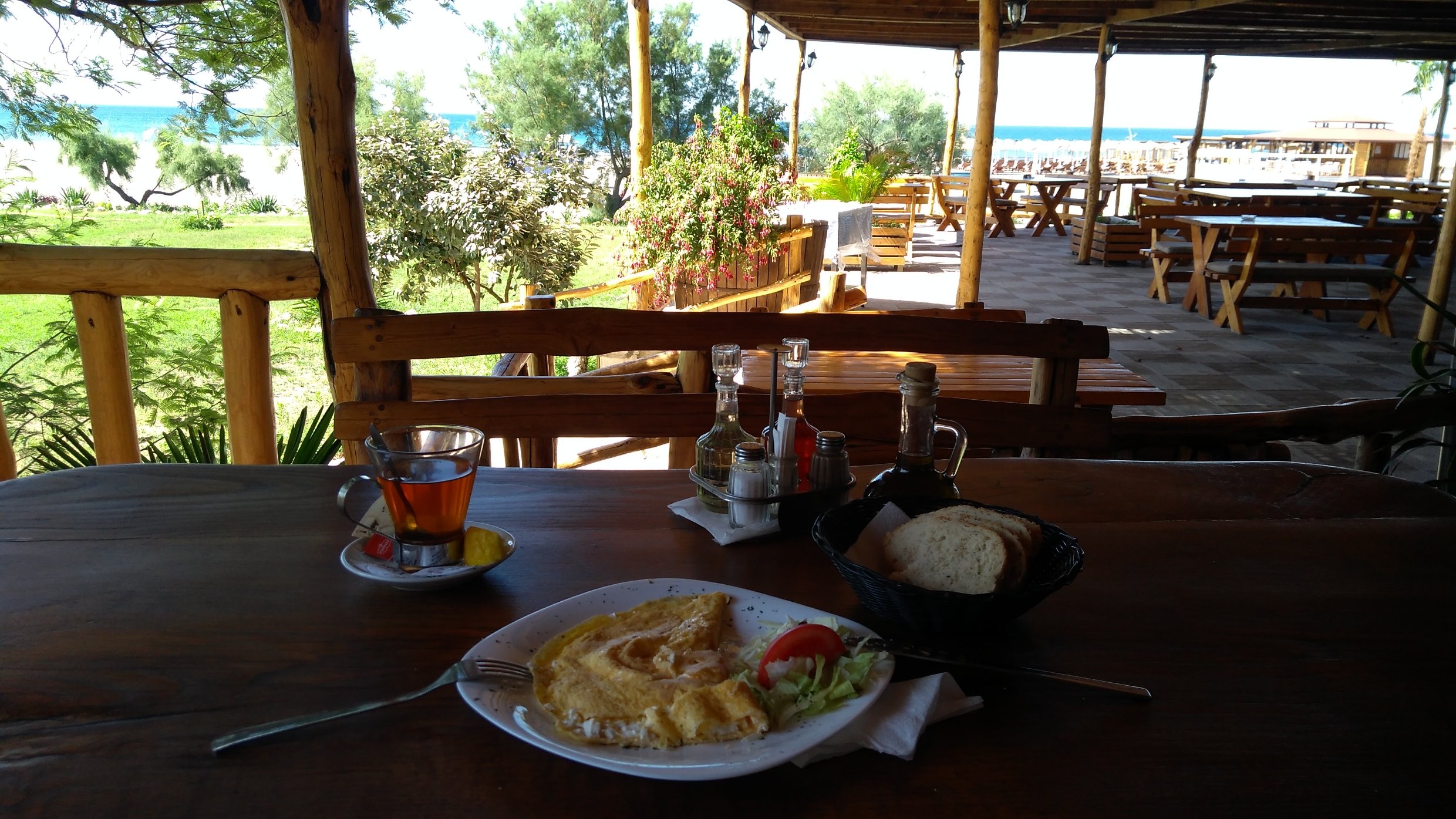 Am Morgen wieder als erstes eine Runde im Meer, duschen, abbauen, Omelette zum Frühstück. Das kommt dann wieder erweitert um angebratene Feta-Stücke, Fleischstreifen, Oliven, Gurken, Tomaten, selbstgemachte Orangenmarmelade, tollem Brot......