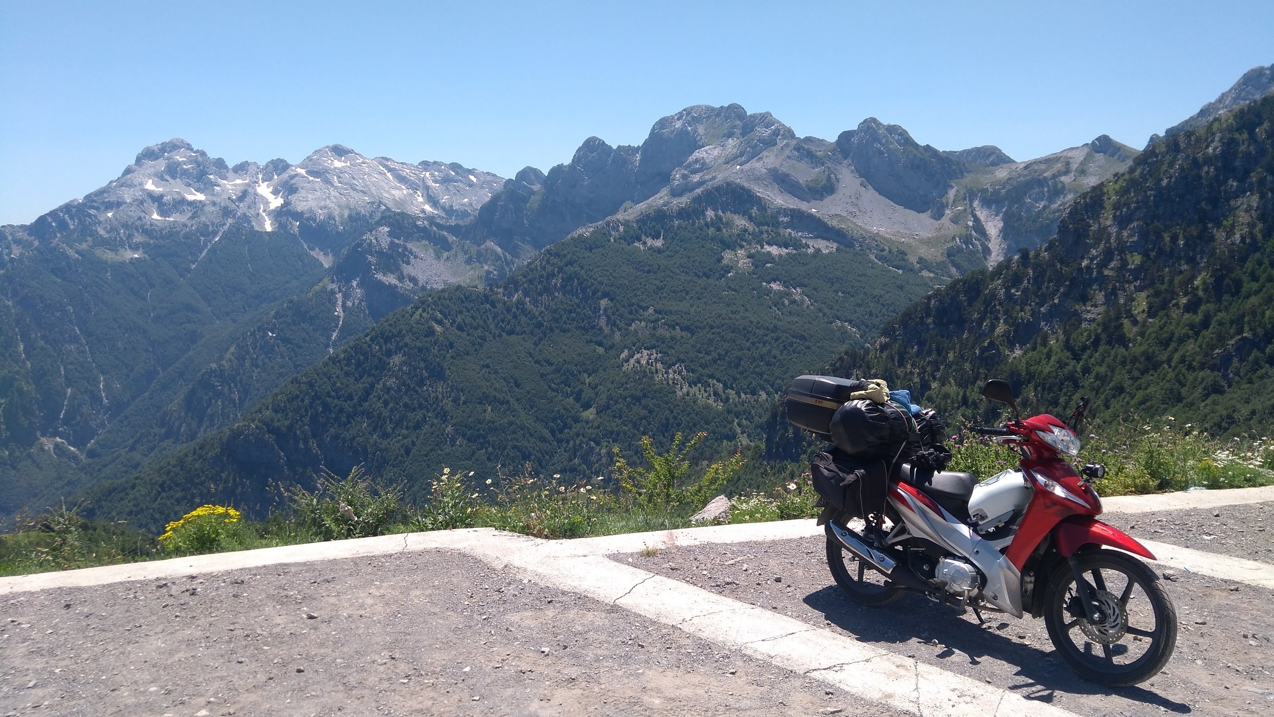 An der Grenze fahren sie direkt in den etwas erhöhten Fußgängersteg. Kurzes Blabla, 110cc... - Ok, you come with us, we're going to Shkoder.