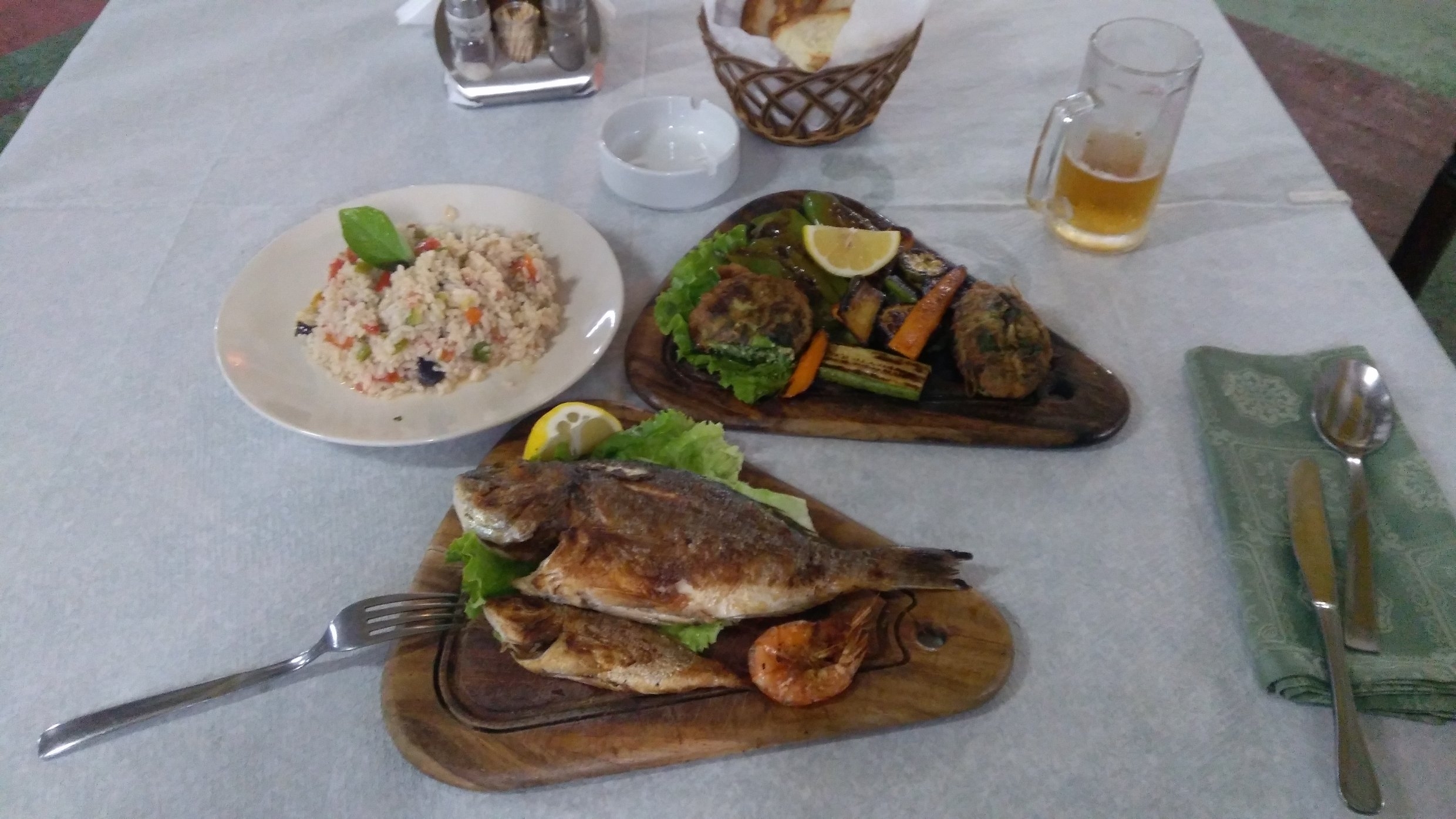 Bei Vlora ist es schon wieder dunkel, eine nette Urlaubsstadt am Meer, aber ich will wieder direkt am Meer campen und fahre noch weiter zum Fish House bei Orikum. Die haben eine kleine Wiese für Camping, ein Wohnmobil und ein Landcruiser aus Deutschland stehen auch schon da, das Zelt soll fünf Euro kosten. Also aufgebaut und erstmal ein Bier bestellt. Ja, Fisch wäre gut. Man bringt die gekühlte Platte mit frischen Fischen. Den nehme ich, dazu Gemüse und Reis. Und dann stellen die mir doch eine halbe Stunde vor Mitternacht ein opulentes Fischessen vor die Nase. Die gebratenen Taler aus Frischkäse und grünem Zeug, der Hammer! Danach werden noch unaufgefordert hellgrüne Melonenstückchen gereicht. Perfekt!