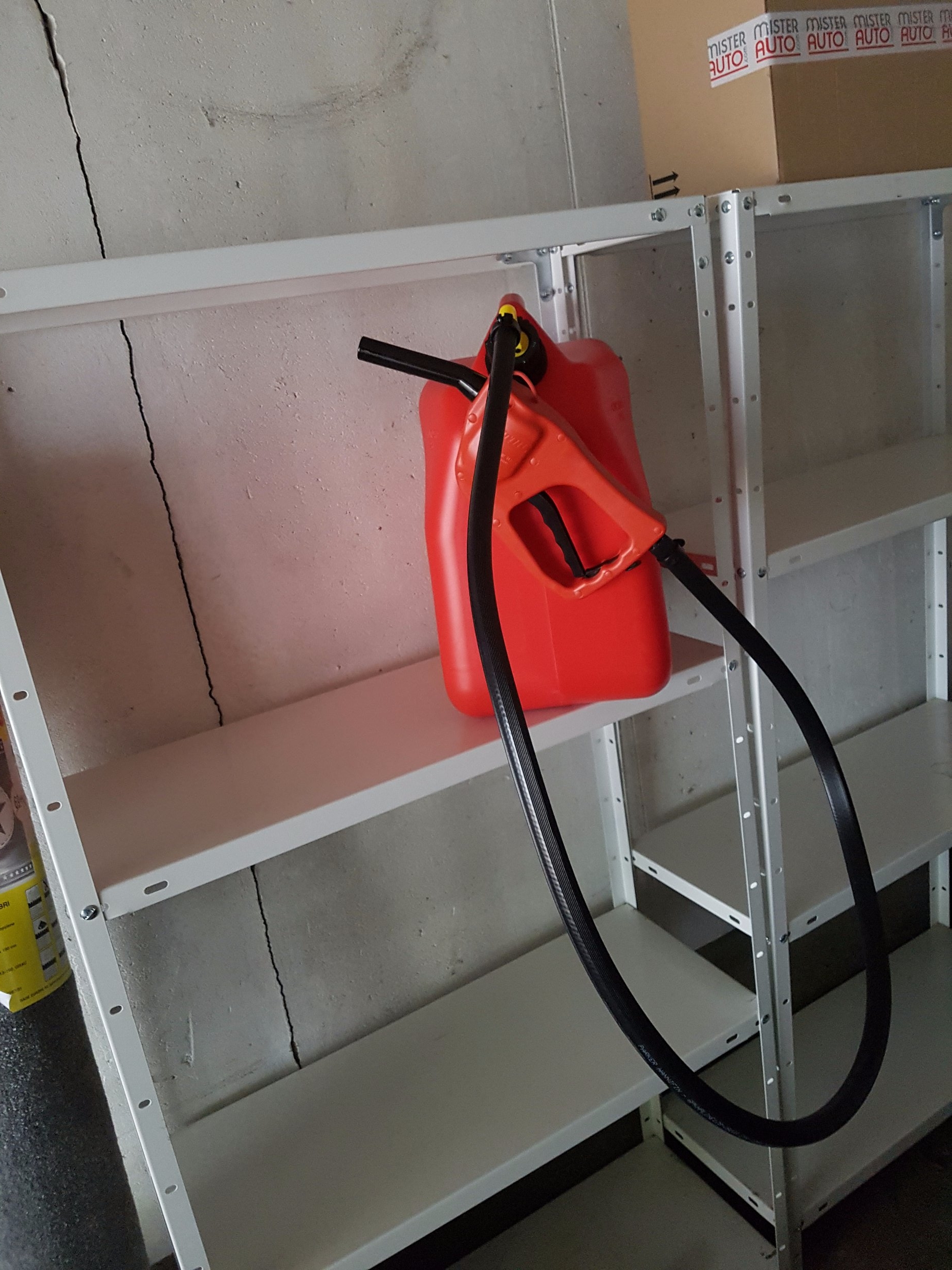 Wenn der Tankstellenkanister leer ist einfach runter auf den Boden und einen der anderen Kanister hoch. Den Schlauch kann man aus dem Tankkanister entnehmen und auch in andere Behältnisse stecken. Dann den Tankkanister füllen. Leeren runter. Vollen Tankkanister rauf aufs Regal. Und schon hat man wieder über 1000km Cub Sprit zapfbereit.