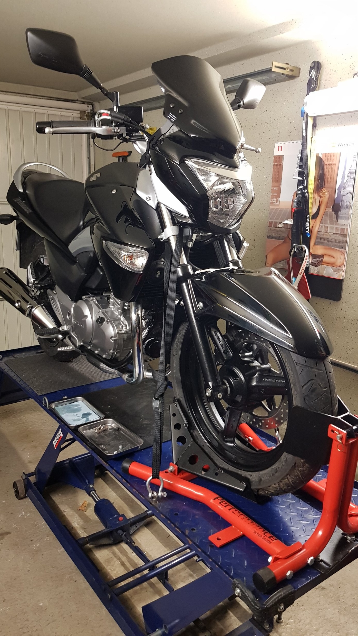 Ölschauglas, Ölfilter extrem gut erreichbar, Auspuffseite Rechts demontiert, Hauptständer montiert, Elektropuzzi zum Einsatz gebracht, Bremssättel gereinigt und Fluidwechsel mit 5.1.