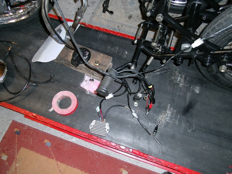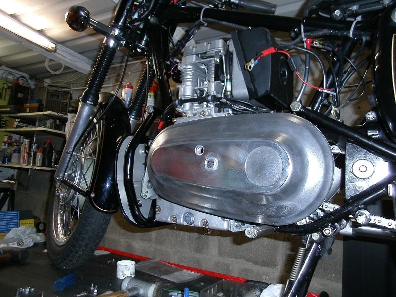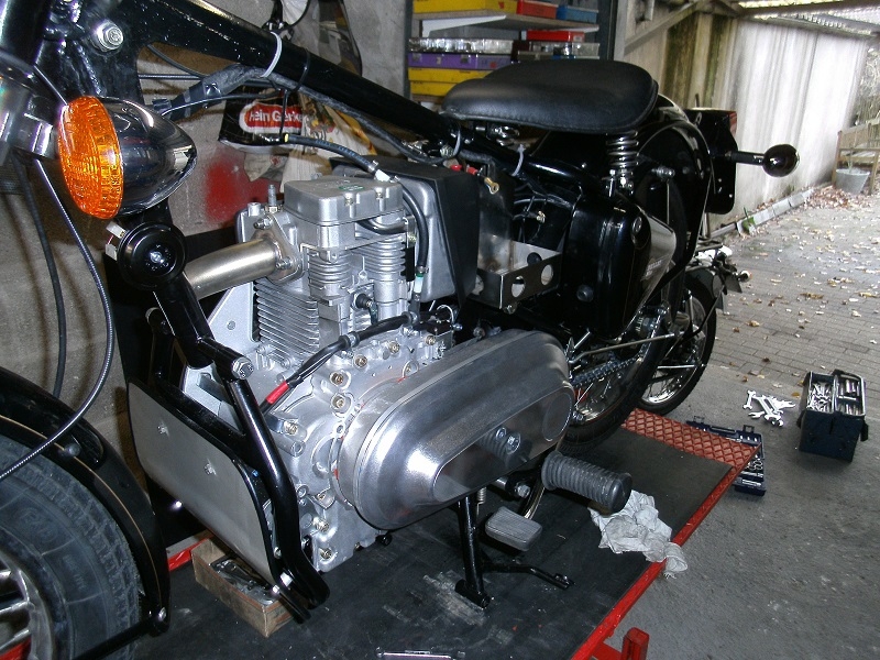 Die Harryfield sollte ein ausgefallenes Stück mit Hatz Motor werden. Die neuen Alu Tanks die Jochen Sommer auf seinen neuen Rahmen verwendete gefielen mir sehr gut, da ich aber einen alten Enfield Rahmen verwende musste eine Halterung dafür gebaut werden die mir mein Kumpel Johannes anfertigte danach bot Jochen ähnliche Halterungen für den alten Rahmen an. Die Gepäckbrücke wurde aus VA gefertigt und eine Alu Platte konnte zusätzlich aufgesteckt und mit Splinten von unten gesichert werden. Der Schalldämpfer wurde leicht nach oben gezogen und die Schutzbleche sowie Haltestreben aus VA gewählt die Steben lies ich mir anfertigen gibt es aber mittlerweile auch beim Jochen. Stoßdämpfer wurden von Ikon genommen den Alu Tank hatte Jochen einen Proto Typ den ich Preisgünstig bekam musste allerdings Lackiert werden was aber mit den Anklebern sehr gut wurde. Das ganze Fahrzeug wurde erst zusammen gebaut Getüft und danach noch ein Paar Sachen geändert. Der Sattel wurde mit einer Roten Borde und Harryfild Schrift versehen ,Primär Kasten sowie Bremsankerplatte wurde von Jochens neuen Maschinen übernommen.