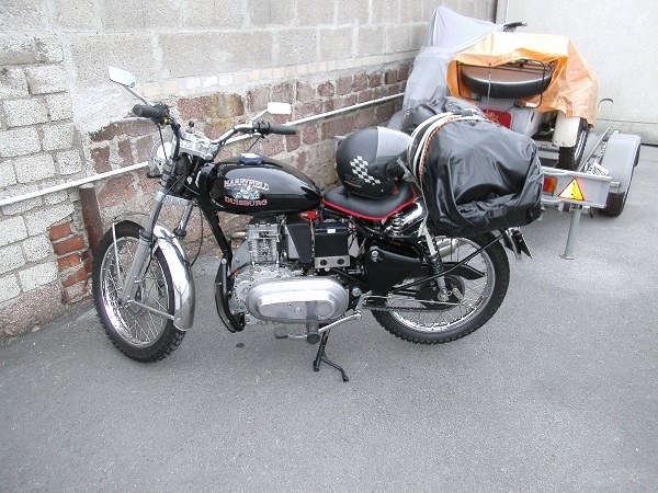 Die Harryfield sollte ein ausgefallenes Stück mit Hatz Motor werden. Die neuen Alu Tanks die Jochen Sommer auf seinen neuen Rahmen verwendete gefielen mir sehr gut, da ich aber einen alten Enfield Rahmen verwende musste eine Halterung dafür gebaut werden die mir mein Kumpel Johannes anfertigte danach bot Jochen ähnliche Halterungen für den alten Rahmen an. Die Gepäckbrücke wurde aus VA gefertigt und eine Alu Platte konnte zusätzlich aufgesteckt und mit Splinten von unten gesichert werden. Der Schalldämpfer wurde leicht nach oben gezogen und die Schutzbleche sowie Haltestreben aus VA gewählt die Steben lies ich mir anfertigen gibt es aber mittlerweile auch beim Jochen. So nun zu Bildern