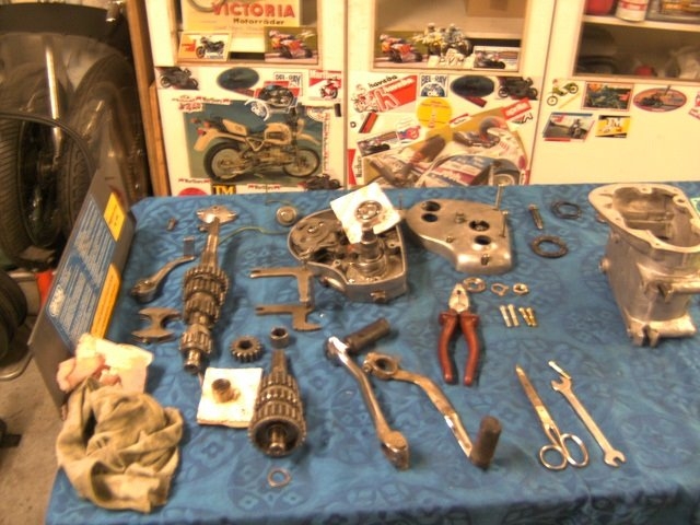 Nach dem wir das Motorrad zerlegt hatten konnten wir sagen das so gut wie alles inne Wurst war na ja immerhin ein Rahmen mit Geschichte :wein: Aber es sollte weiter gehen wir suchten alle Getriebe Teile zusammen die auf verschiedenen Kiesten verteilt waren Säuberten sie und bestellten Teile die wir zur Reparatur brauchten. Der Motor hatte keine Kompression mehr und müsste auch Komplett Überholt werden. Wir entschlossen uns dann dazu da Johannes noch einen Neuwertigen Motor hatte ihn komplett zu Tauschen das Getriebe wurde zwar Repariert machte aber noch Schwierigkeiten und wurde ebenfalls durch ein neues Ausgetauscht sowie Kupplung und Primär Kette plus Spanner.