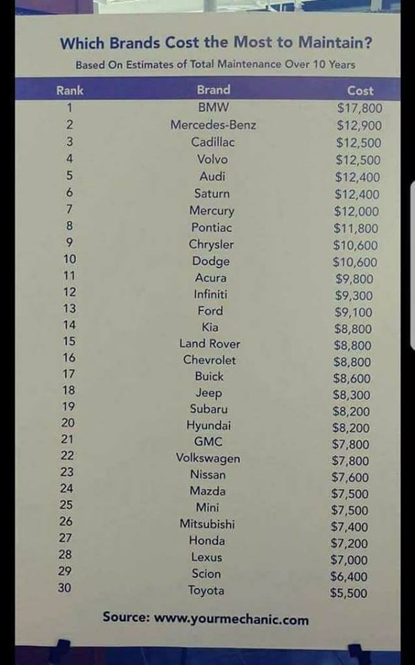 Wartungskosten spiegeln nicht die Qualität des Fahrzeuges. Das ist mir auch bekannt. Aber einerseits wird eine Garantieleistung meist verweigert wenn die Wartungen nicht regelmässig und lückenlos erledigt wurden und andererseits ist Toyota der Innovationstreiber in Sachen SixSigma/LEAN in der gesammtne Automobilindustrie.