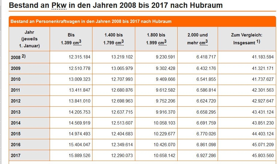 Aber auch die hier. Da fragt man sich was das ganze Geschrei von SUV usw nur soll. Autos mit Motoren über 1999 ccm sind in der fast verschwindenden Minderheit. Und das hat sich seit 10 Jahren nicht geändert.