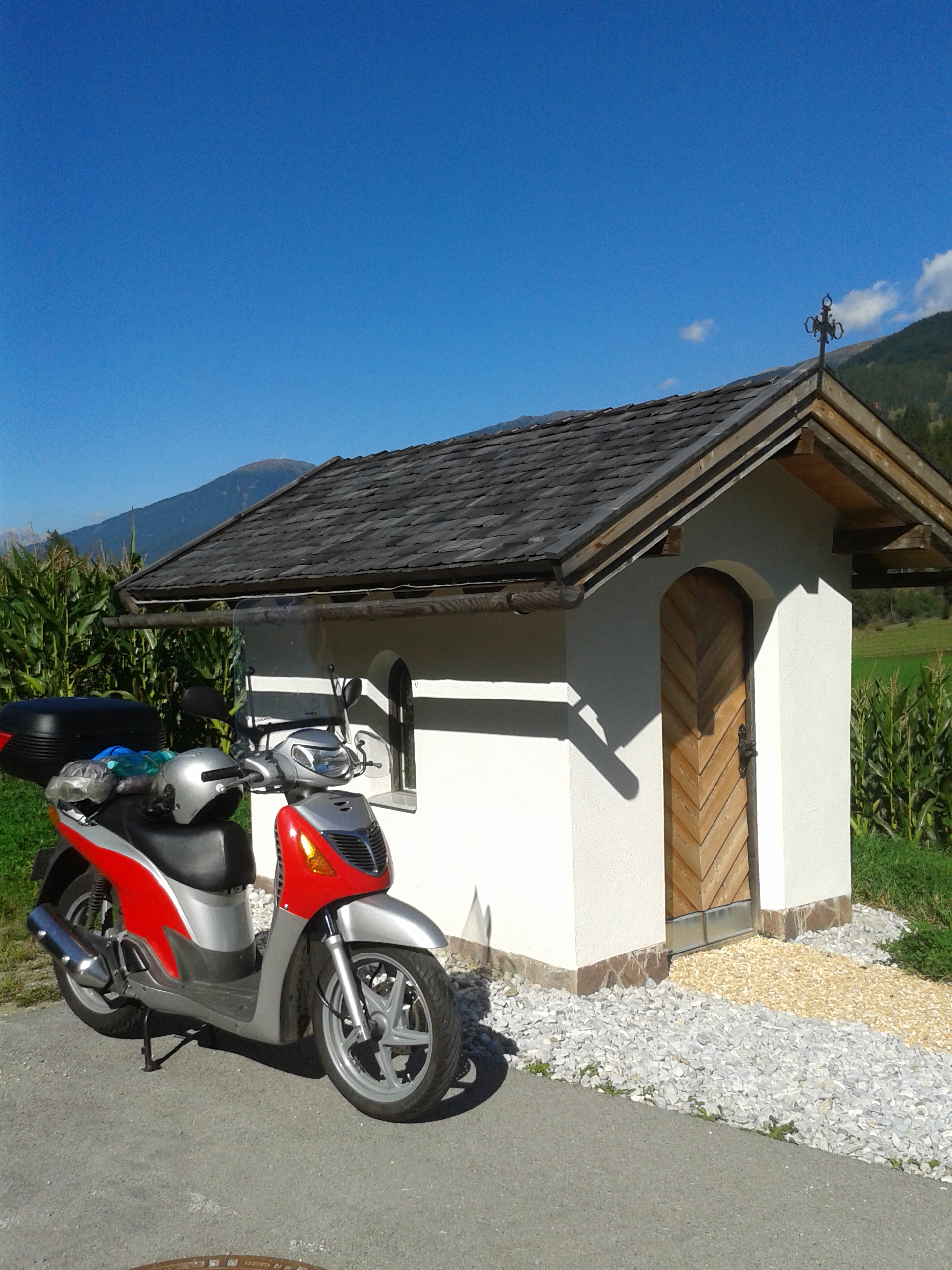 Eine kleine Kapelle (Kreuz am Dachgiebel), ein Maisfeld im Hintergrund, weiter hinten hohe Berge. Muss irgendwo in einer katholischen Alpenregion sein. Mal so ein Schuss aus der Hüfte: Region Oesterreich?