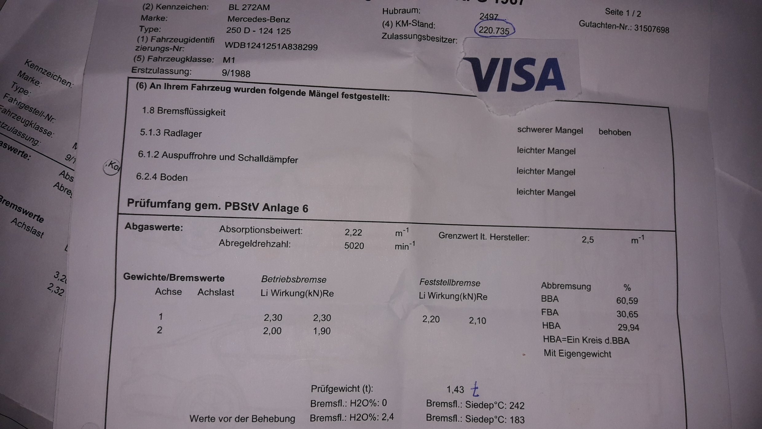 Fazit nach dem ersten Pickerl. Ein Bauernauto mit nachgerüsteter Klima, mit 31 Jahren und 4 Monaten dürften etliche Kunststoffe schon sehr verhärtet!!, ausgetrocknet, die Weichmacher sind verdunstet. Wegen der niedrigen Fahrleistung mussten diese Teile: Motorlager und ähnliches noch nicht gewechselt wurden. Vo. und hi. Bremsen sind neu, der Auspuff ist dicht. Das Radlager kostete 60, der Einbau 40.