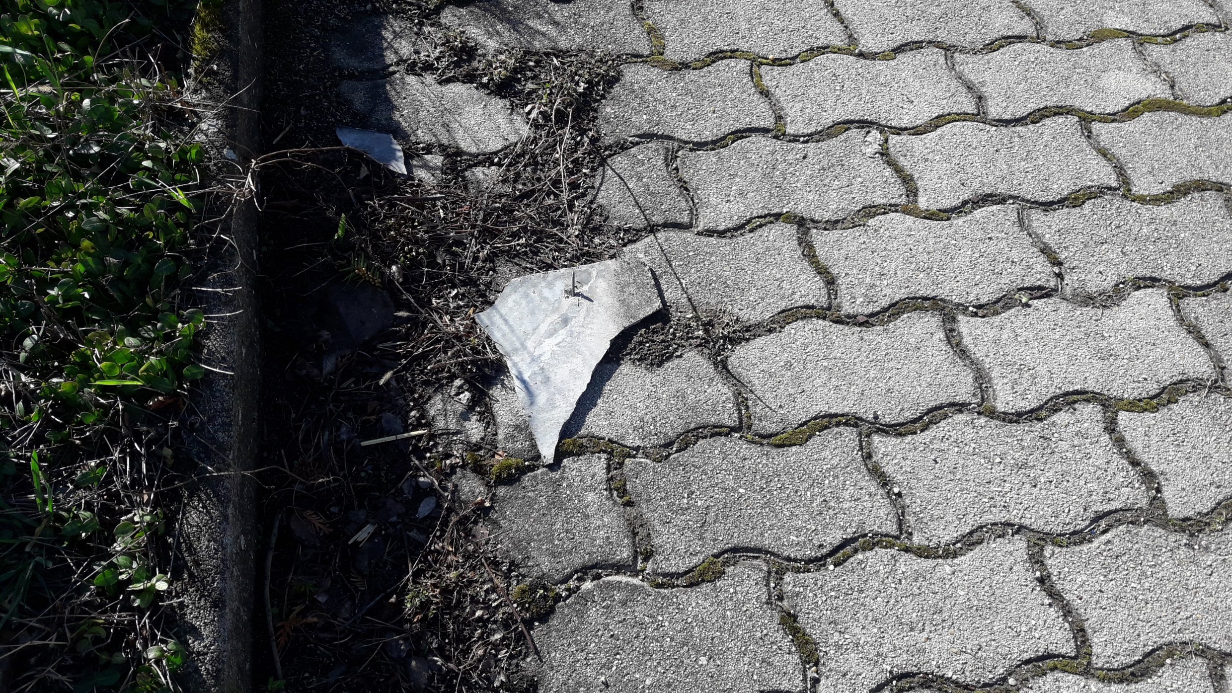 Nun, ich fuhr mit SUBI 5 oder 6 Runden im Garten. Da bemerkte ich, dass 2 zerbrochene graue Dachschindeln bei Silberwolke's Heck herumlagen. Die eine Schindel hat einen scheinbar neuen Nagel drinnen. Silber dürfte nicht getroffen/beschädigt worden sein. Es war ein Sturm ganze Nacht - gut für die Windkraft - und die Schindel könnte von überall her sein, nur nicht von meinem Dach.