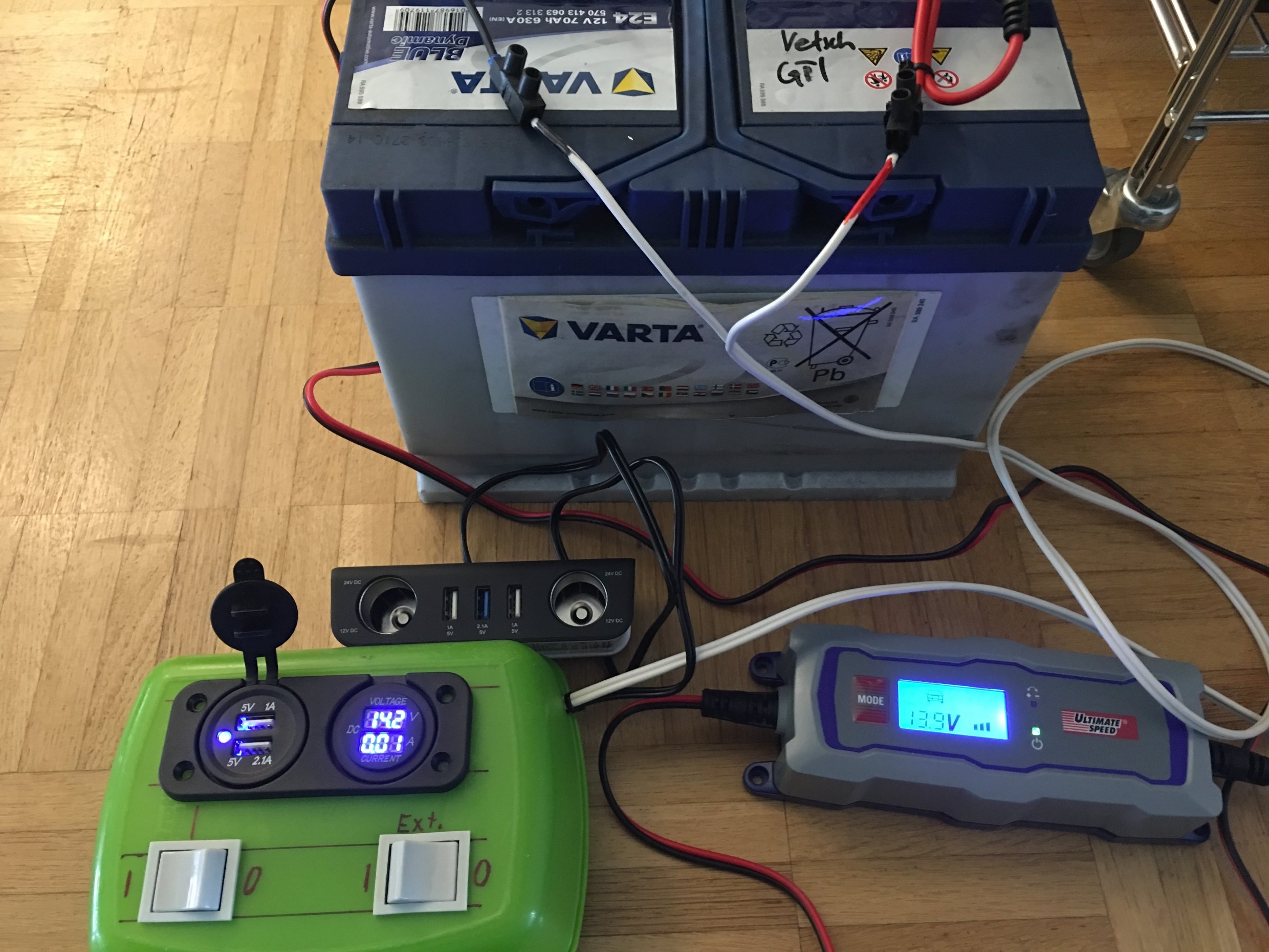 Add: Bevor sich jemand Sorgen macht: Die ganze Bastelei ist an der Batterie 10A abgesichert. Das reicht für die Geräte die ich anhängen will und dürfte bei einem Fehler rasch genug auslösen.