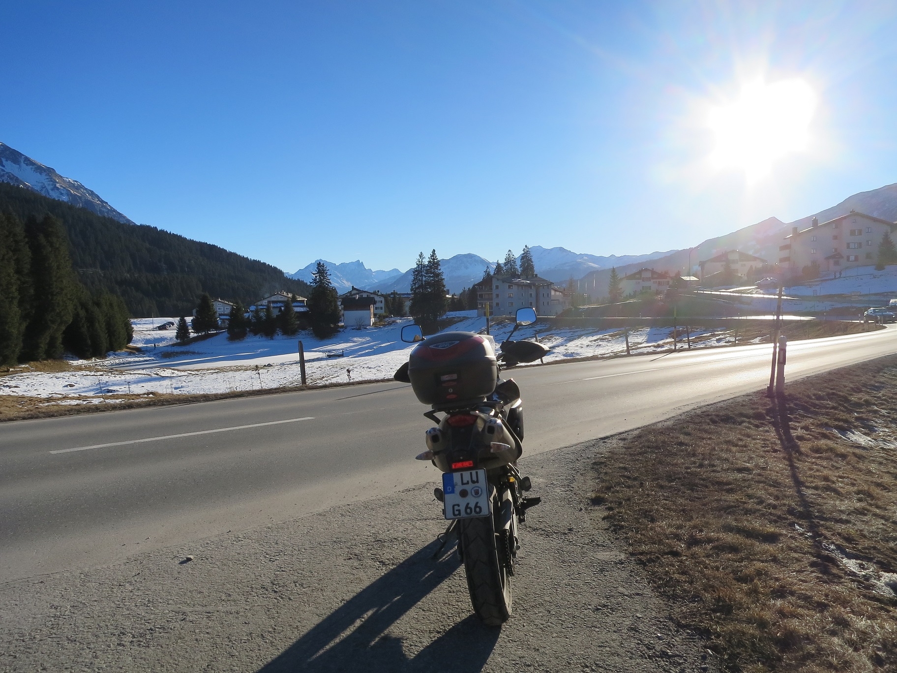 Ob die ganzen Wintersportler sich nicht deplatziert vorkommen, wenn ein Motorradfahrer vorbeifährt?