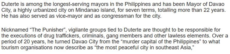 Wer etwas mehr darüber wissen will und Lust hat mehr zu lesen als die flachen Sprüche der westlichen Boulevardmedien und wer dahinter sehen will der kann sich ja mal mit dem Wiki Eintrag von Didong beginnen. Der ist hier zu finden. Er wurde mehrmals in Davao als Major bestätigt! Das wohl kaum, weil er es schlecht gemacht hat.
