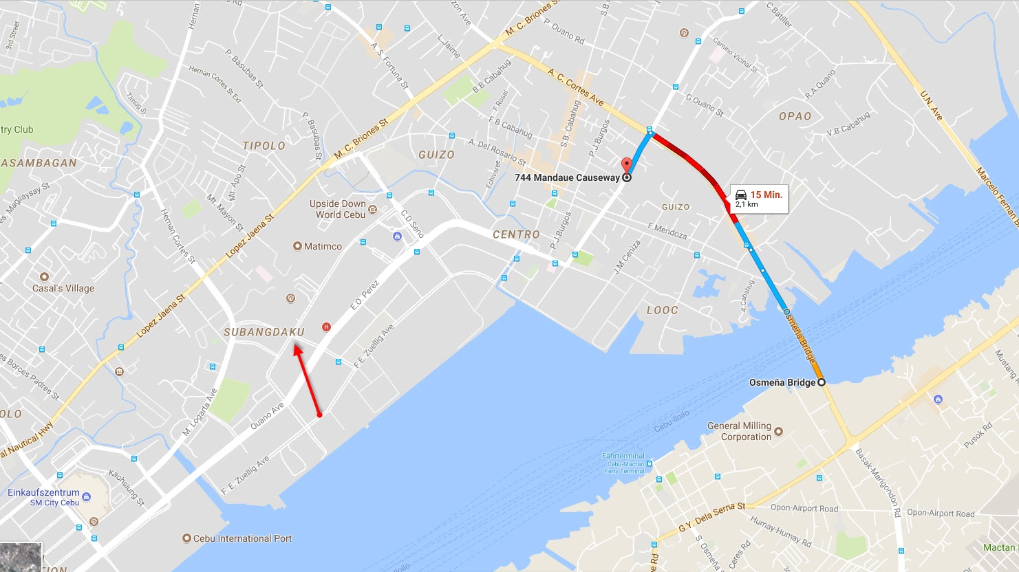 Hier ist die Uebersichtskarte wo man die Route, die auf den Video zu sehen ist, markiert ist. Ich fahre diese Strecke mehrmals wöchentlich. Denn wir wohnen ja auf einer sehr kleinen Insel (Cordova) die mit der etwas grösseren Insel (Mactan) via eine Brücke verbunden ist. Von Mactan wiederum gibt es zwei Brücken die einem dann finally auf die grosse Insel Cebu bringen. Also auch nach Cebu City zum Einkaufen und so.