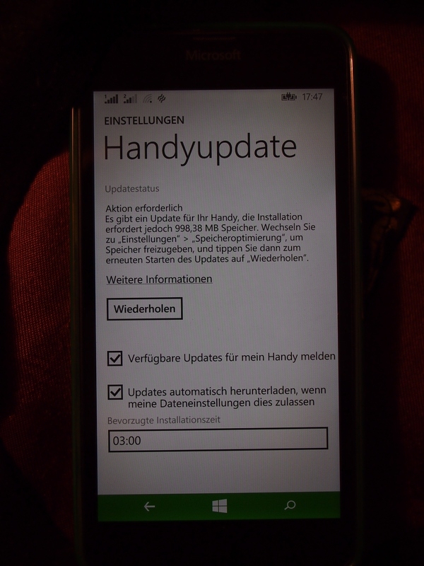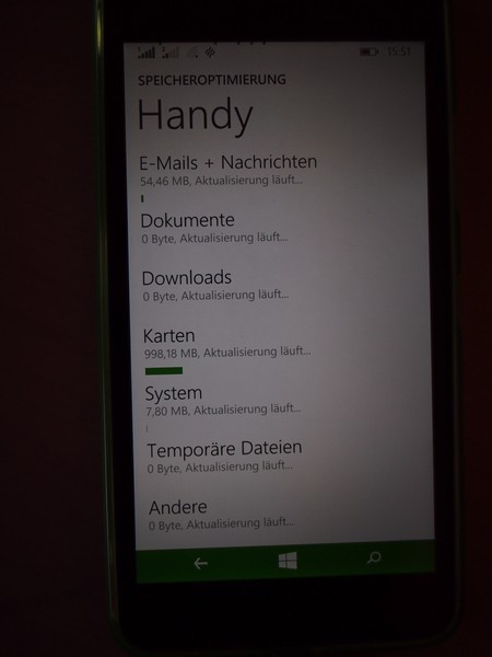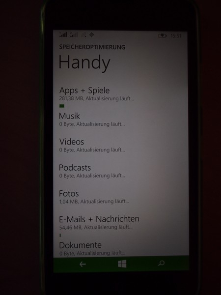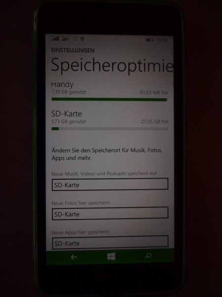 Bei mir heißt es, das ich Speicherplatz im internen Speicher wg des updates freigeben soll. Aber alles verfügbare ist bereits auf der Karte. Das sind meine Grundeinstellungen. ich soll das Lumia an den PC anschließen und die Speicher dort bearbeiten. Aber alle unter Windows Phone dort aufgeführten Speicherorte sind leer. Mal sehen.
