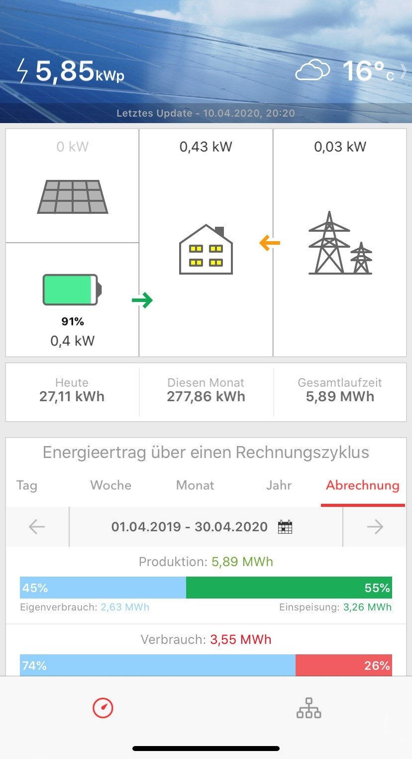 Es wird nahezu 3/4 Autakie erreicht, das ist ein ganz guter Wert. Speicher ist übrigens 9,8 kWh brutto (nutzbar 9,2 kWh).