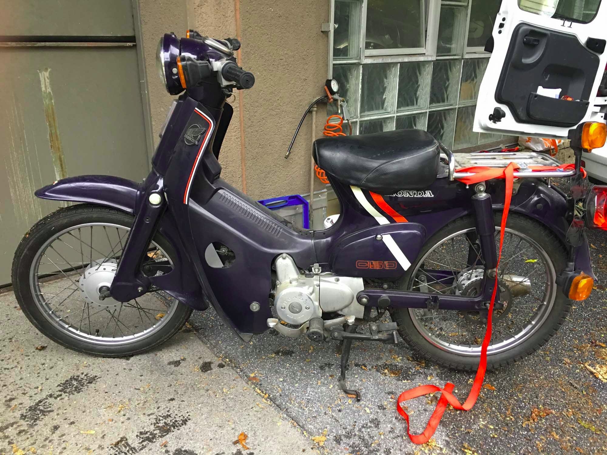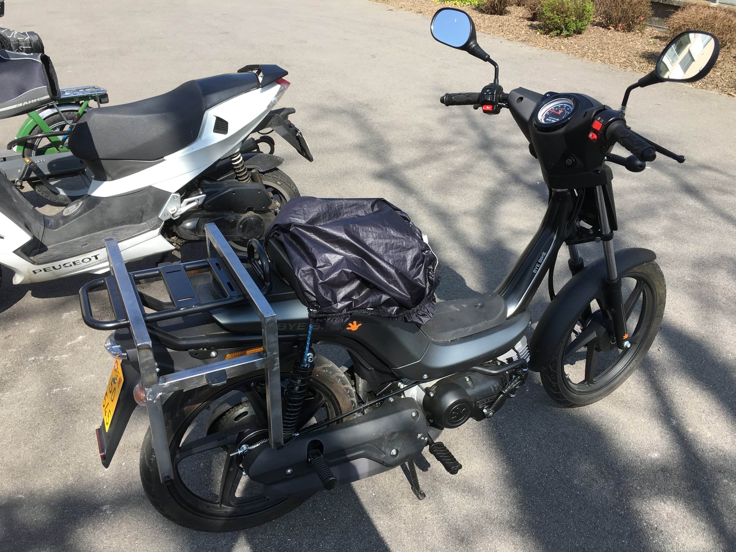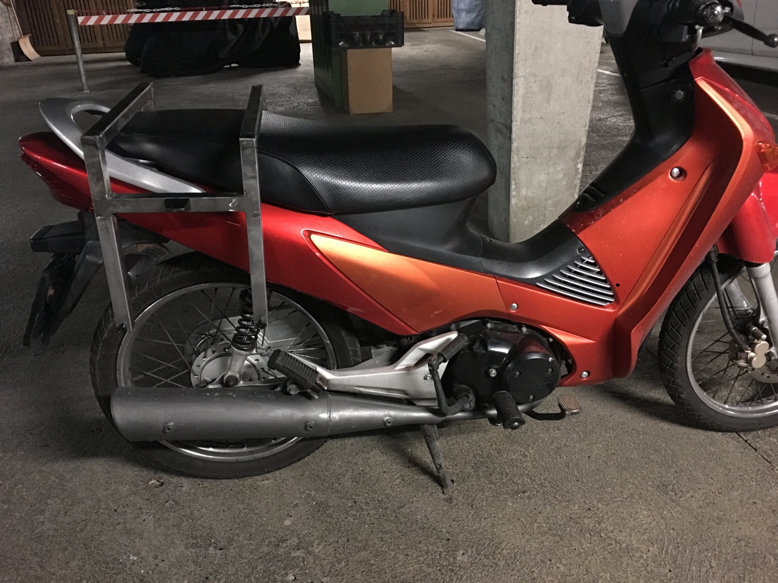 Habe die Halterung etwas breiter als absolut nötig gestaltet. Nun passt Sie auf die CUB 50, das ByeBike und man kann das Ding sogar irgendwie auf die Inno "Stell-Leg-Drauf-Rödeln". Befestigung ist spätestens auf der Inno aber noch tauglich zu lösen. Dachte schon mal an eine Verbindung zu den Sozius streben. Kombiniert mit einer art Garnier an der Reling könnte sich eine Gepäck-Lösung ergeben die zum Tanken nach hinten geklappt wird (kein TC) und während der Fahrt auf den Fussrasten abstützt. Aber eigentlich soll an der Inno ja gar kein Gepäck dran...