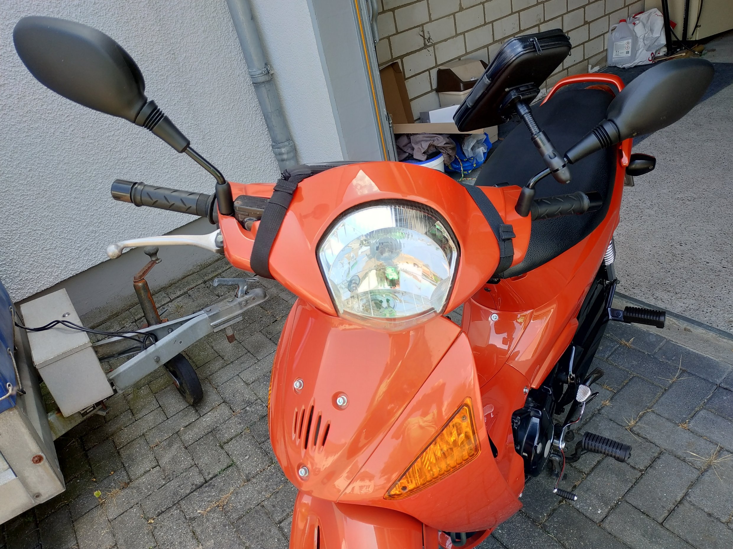 Aber von vorn gefällts mir nicht. Die Riemen verlaufen genau über die Bremshebel.