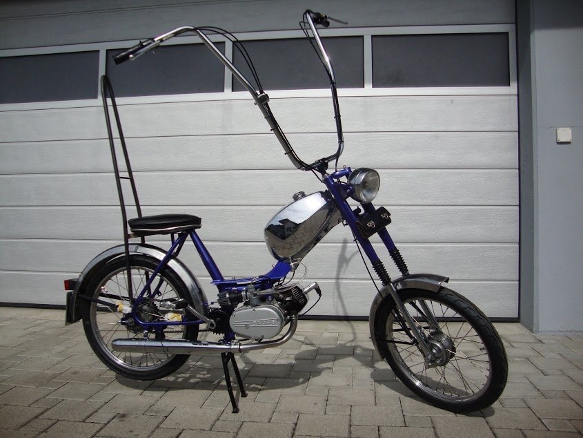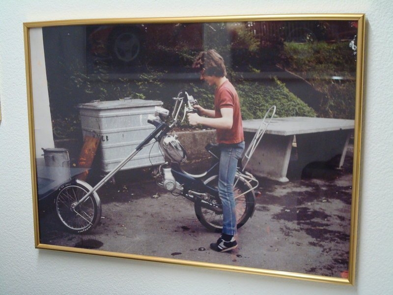 Das Foto ist aus dem Netz. Ich habe keine Fotos aus dieser Zeit. Aber genau so haben die Mofas ausgeschaut. Nur eben die Gabel war komplett scheisse zu fahren. Nicht nur das man damit kaum um die Kurven gekommen ist, es hat auch gewackelt und geschwankt weil die komplette konstruktion wirklich absoluter Müll war. Wir hatten einfach längere Rohre eingebaut!