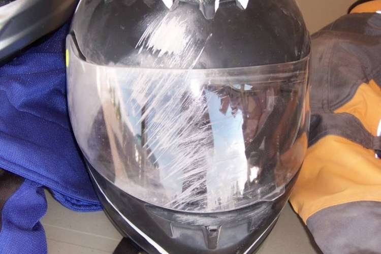 Zum 10 Jahre alten Polykarbonat Helm: Wir haben alte zur Entsorgung vorgesehene Helme mit voller Wucht auf Steine geschlagen, außer abgeplatzte Visiere gabs da nix...