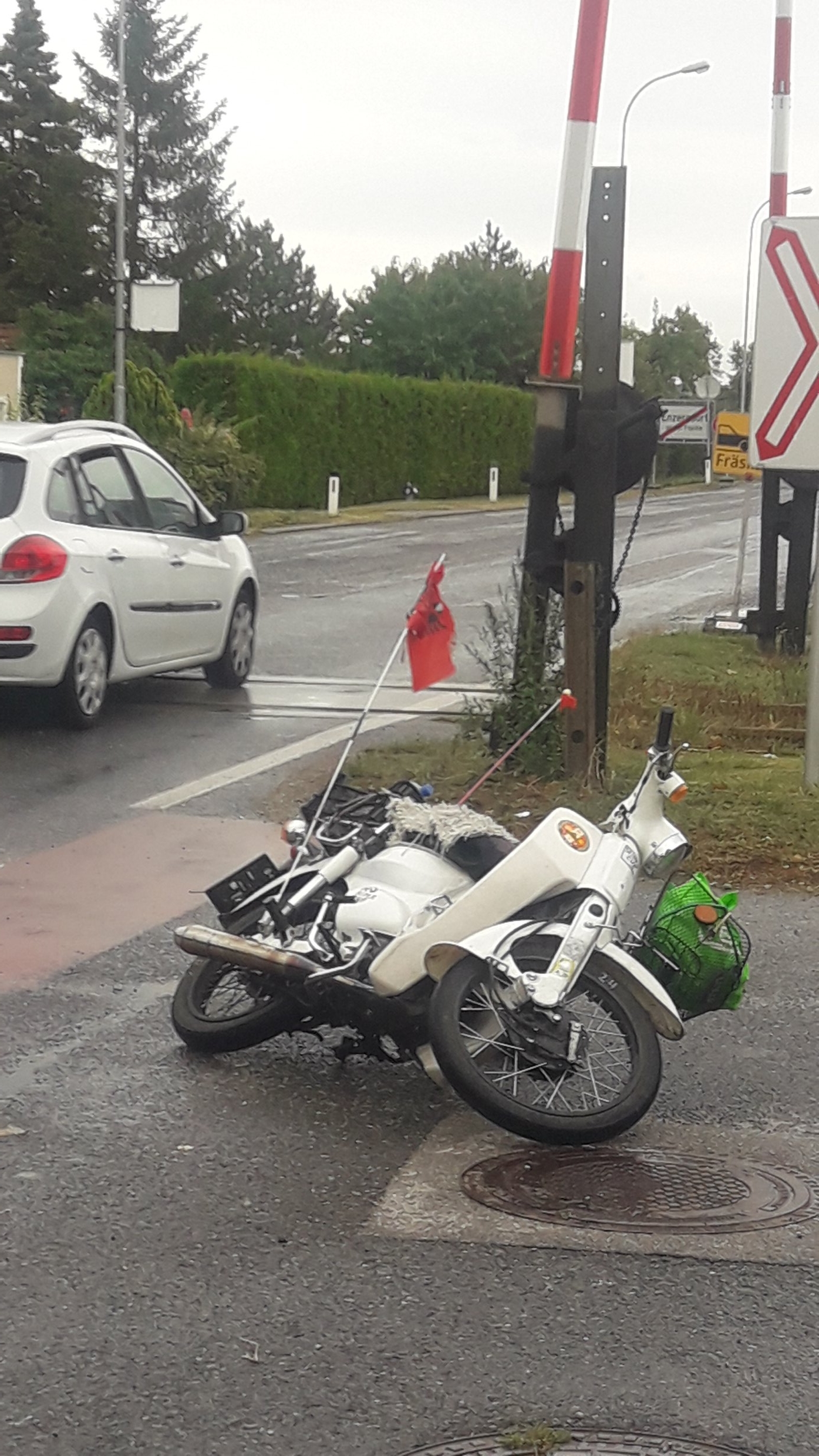 Dann ging es sehr schnell. Bodenhaftung null. Also bevor ich dem den Kofferraum eindelle, überbremste ich hinten und lege mich nieder. Mein allererster Stern mit Storch. Ich kam auf die linke Backe zu liegen, der li. Knöchel hat auch was abbekommen. Da ich einen Rückenpanzer trug, ist der Oberkörper unauffällig. Auch gut.