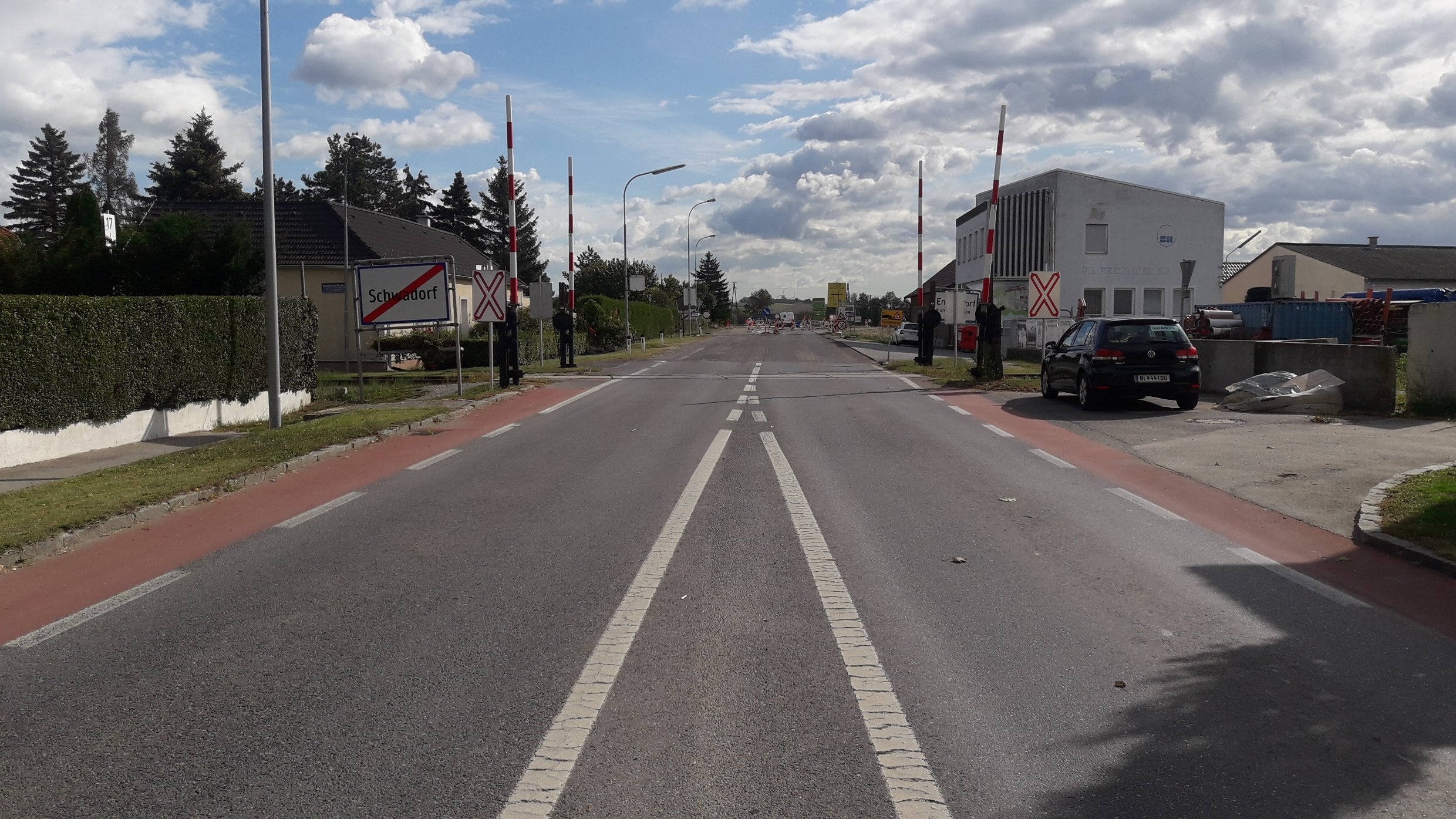 3km vor dem trauten Heim fuhr ich in einer Kolonne 50 im Dorf, als plötzlich alle vor mir auf NULL abbremsren. Wegen einer Fräßkante. Eine neuer Kreisverkehr für das Enzersdorfer Industriegebiet wird gebaut. Zu meinem Pech hielt das Auto unmittelbar vor mir auch noch vor dem "schienengleichen Eisenbahnübergang" an.