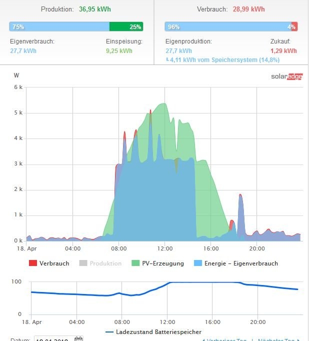 So sieht es aus, wenn ich an einem sonnigen den StreetScooter zu Hause ein wenig nachlade. Nix mit 40 Cent/kWh und der Hausspeicher wird auch noch gefüllt... war übrigens ein Tag Mitte April