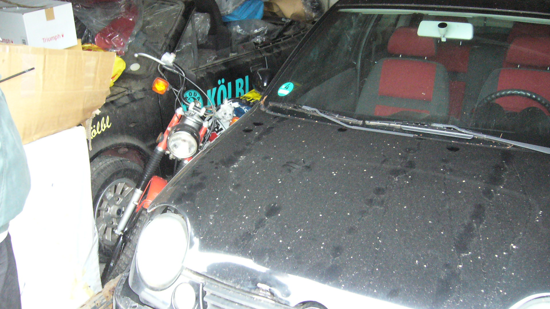 Desweiteren ist die CT zwischen einem BMW Cabrio, (voll mit ca 5 Tonnen Motorradteilen+Schrott), einer riesigen Box, einer AHK, und einem Schrott-Fiat eingeklemmt, und zwar wirklich, DENN DIE BREMSEN DES FIAT SIND FEST!!
