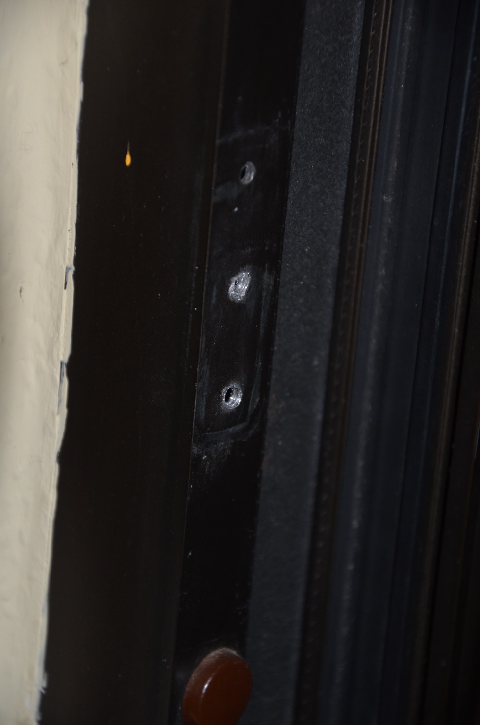 Mir ist heut Nacht eingefallen, dass oben in dem Schließblech wo bei meinem ein Loch ist eigentlich ein Stift ist, der in das obere der am Türrahmen zu sehenden Löcher greift.
